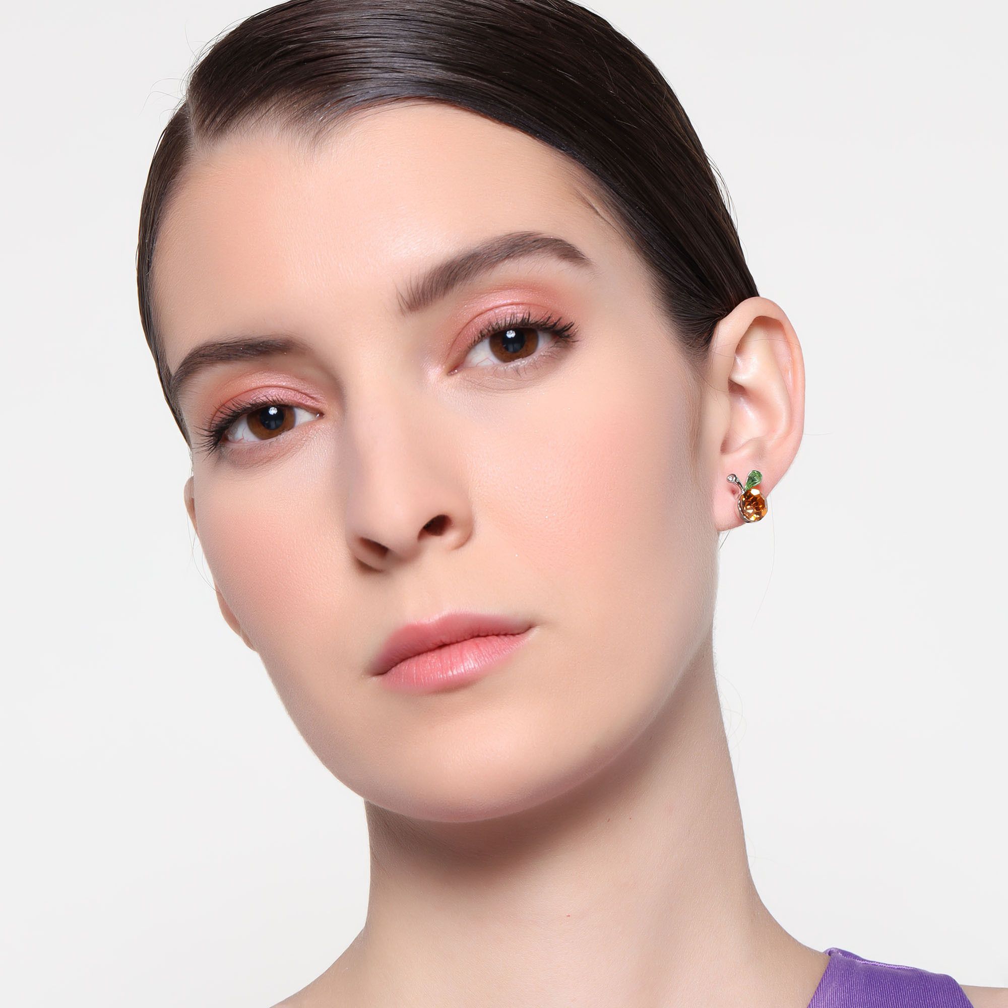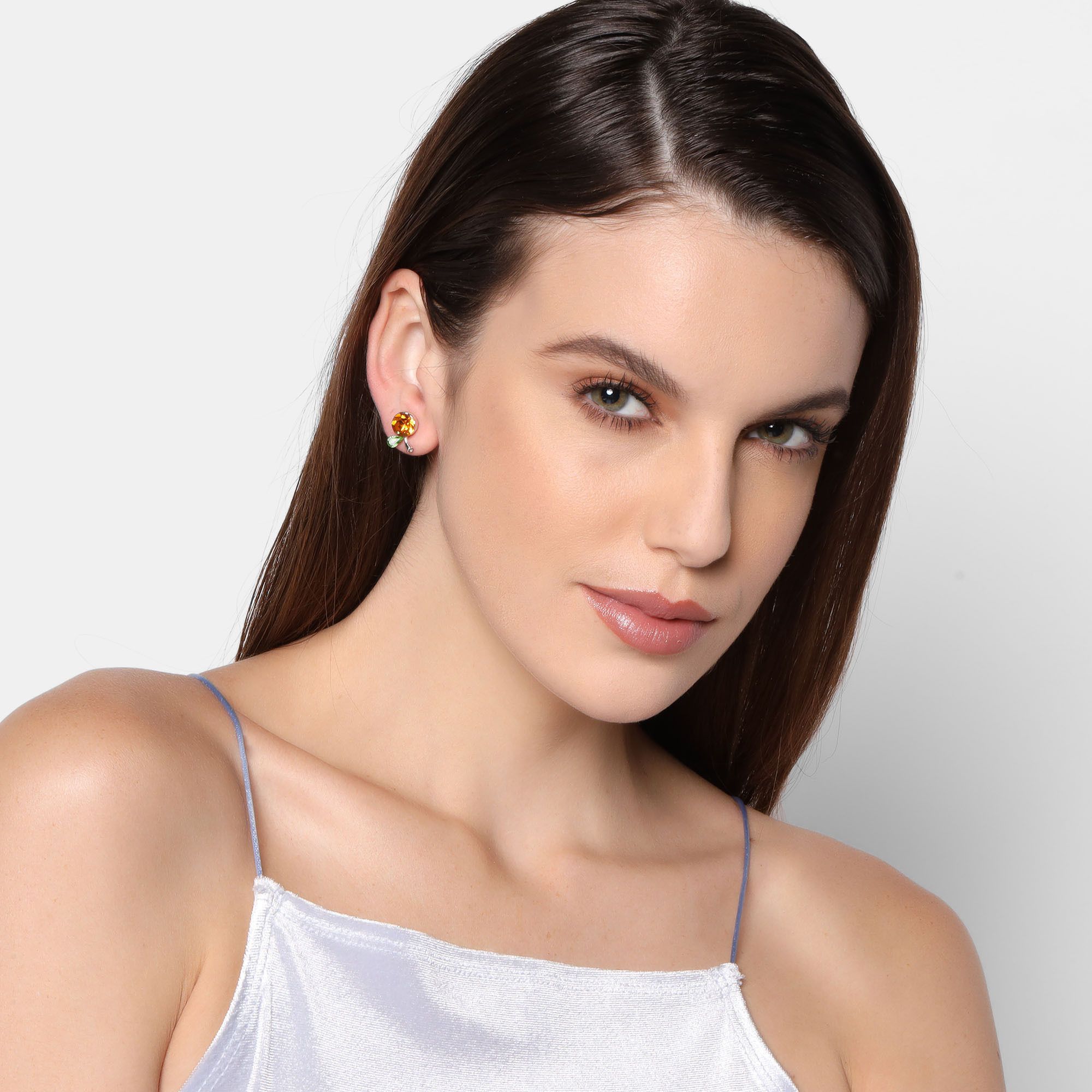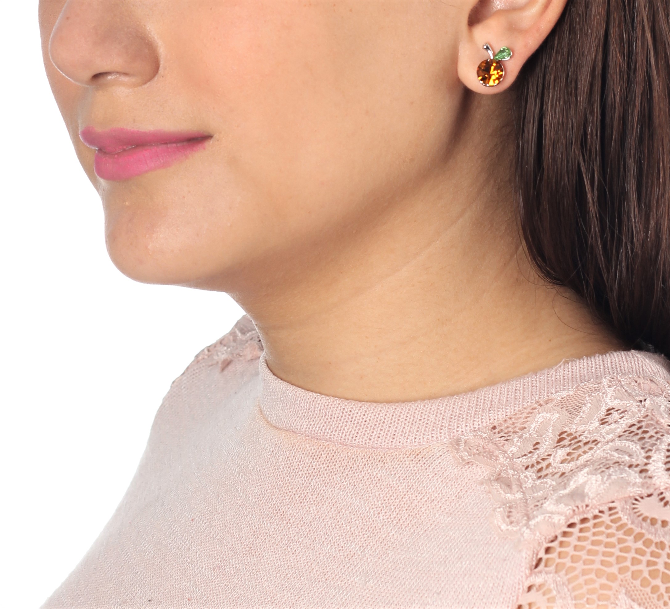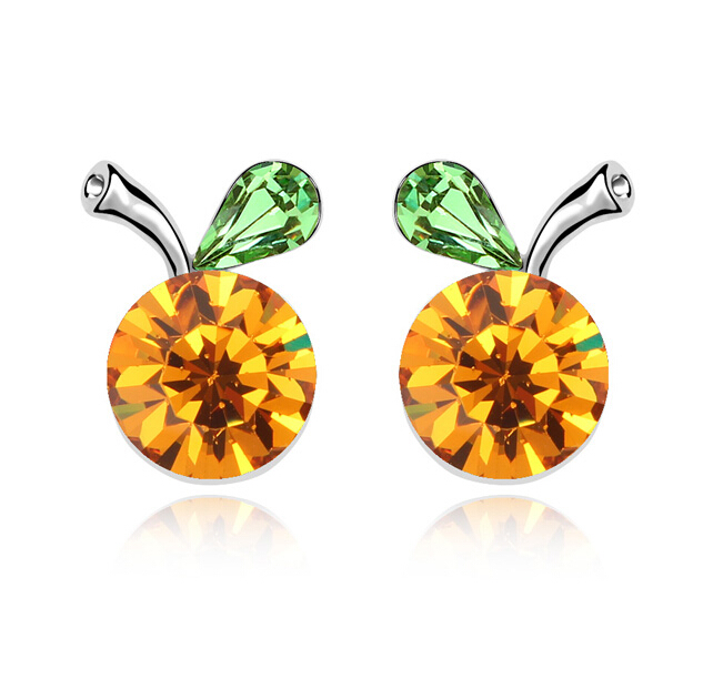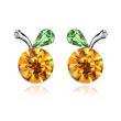 Lindos aretes en baño de oro blanco de 18 quilates, diseño de cereza con incrustación de cristales en color amarillo y verde.