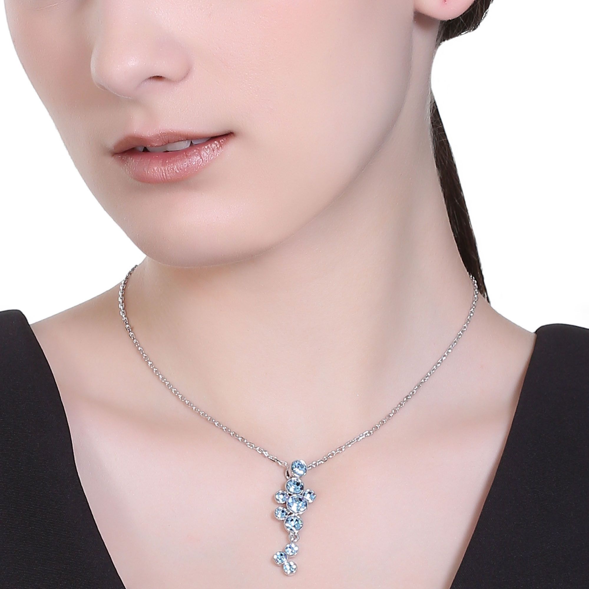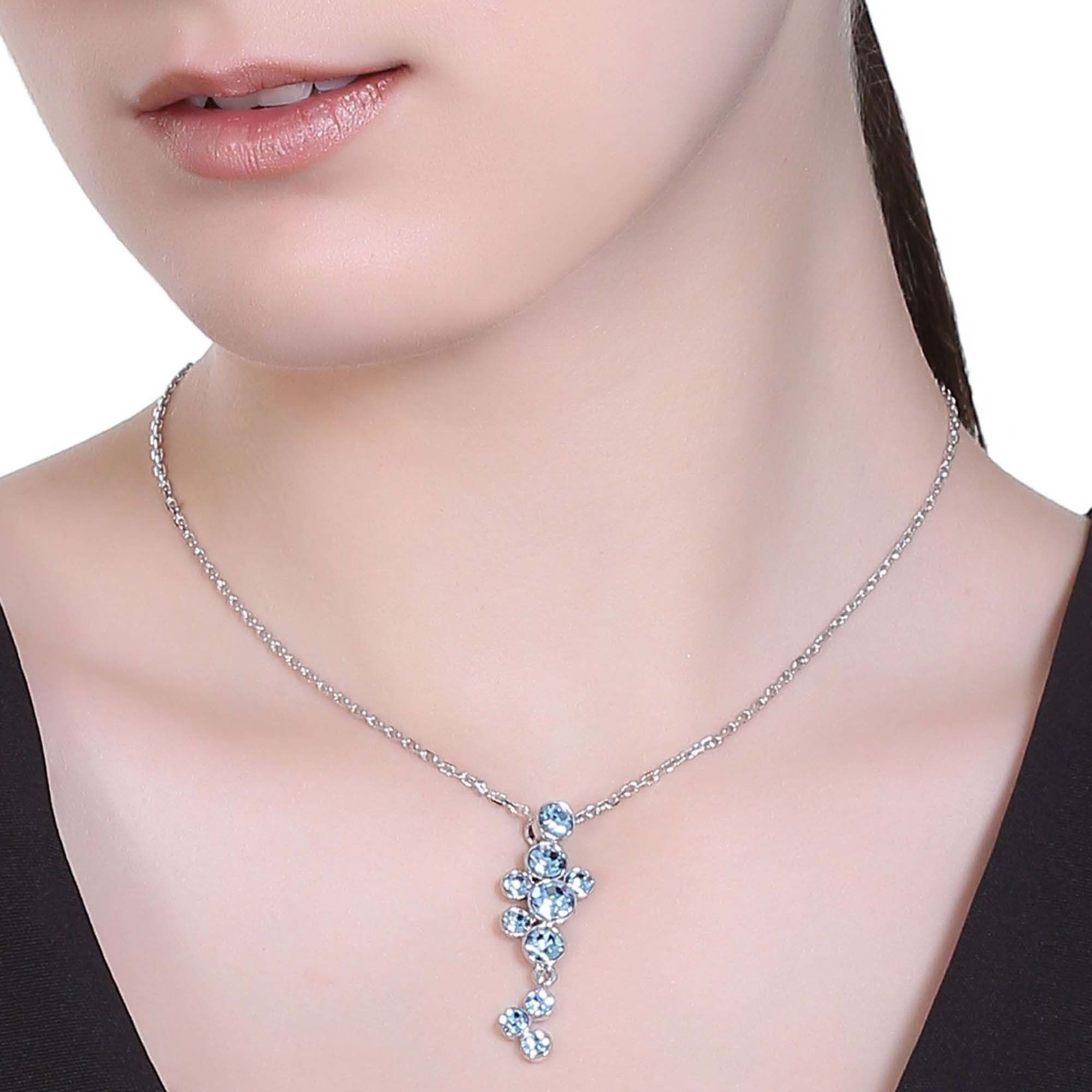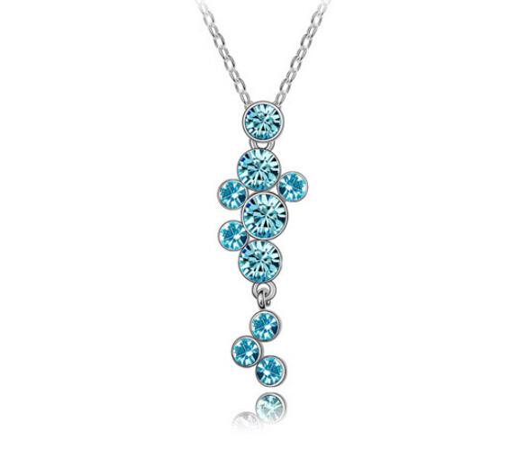 Precioso Collar en baño de oro blanco de 18 quilates, con incrustación de cristales en color azul. Fabricado en una estructura de aleación de platino con rodio sin níquel 1. joyería Hipoalergénica. 2. Incluye cajita de joyería. 3. Garantía de 30 días por defectos de fabrica.