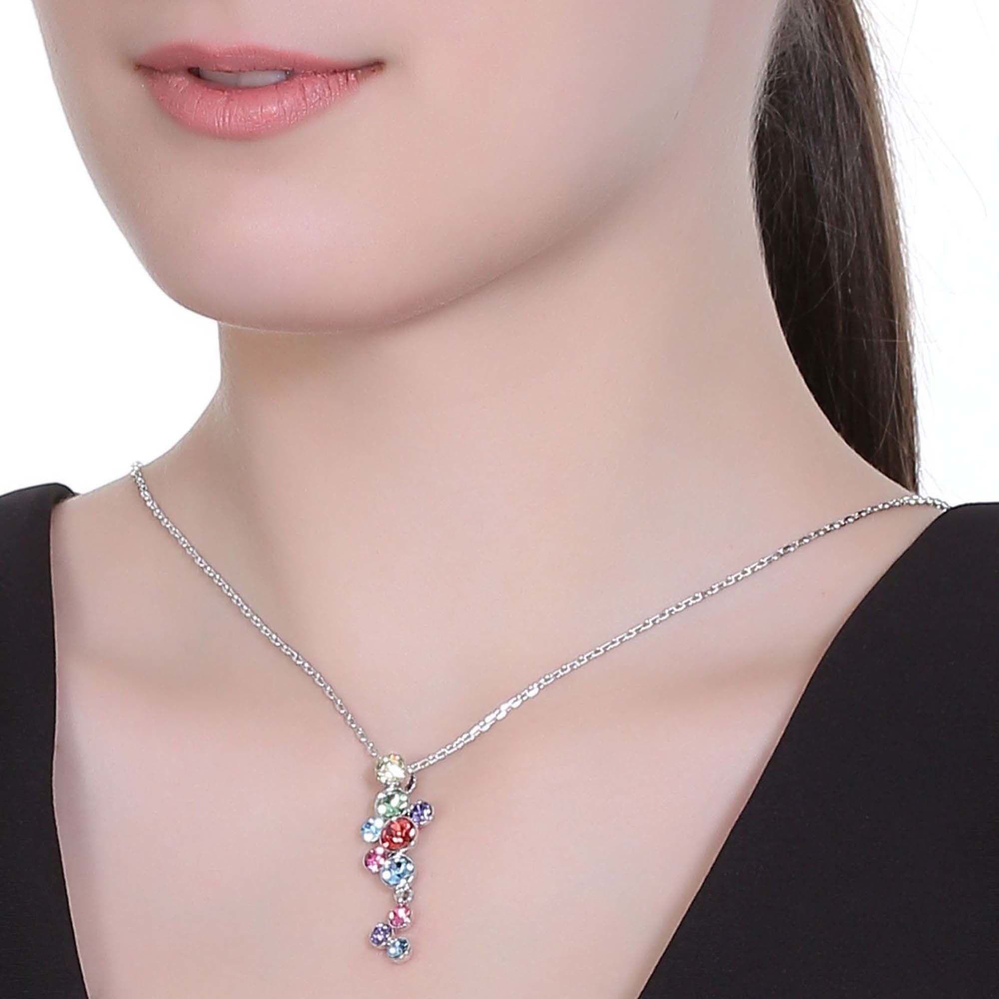 Dije en baño de oro blanco de 18 quilates, con incrustación de cristales en colores. ElCollar tiene una cadena de 40 cm con extención de 5 cm. Fabricado en una estructura de aleación de platino con rodio sin níquel 1. joyería Hipoalergénica. 2. Incluye cajita de joyería. 3. Garantía de 30 días por defectos de fabrica.