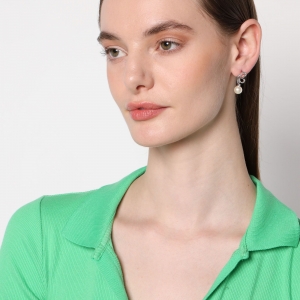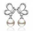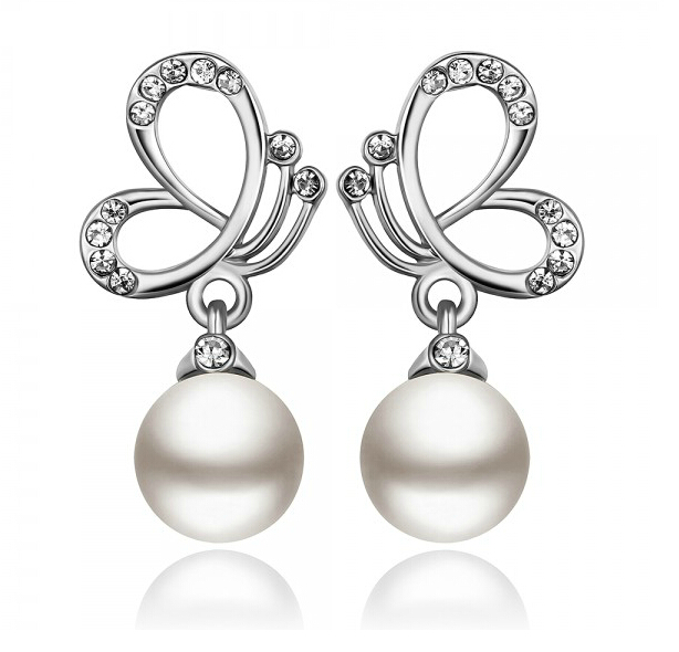 Preciosos aretes en baño de oro blanco de 18 quilates, diseño de mariposa con perla blanca e incrustaciones de cristales blancos.