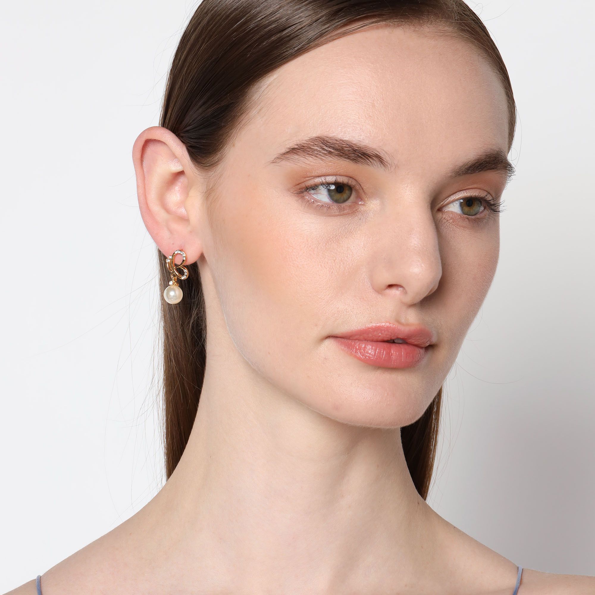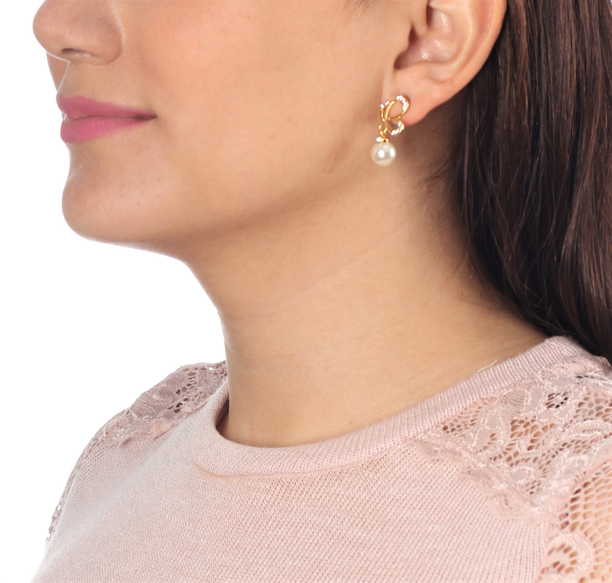 Preciosos aretes en baño de oro amarillo de 18 quilates, diseño de mariposa, con perla blanca e incrustaciones de cristales blancos.