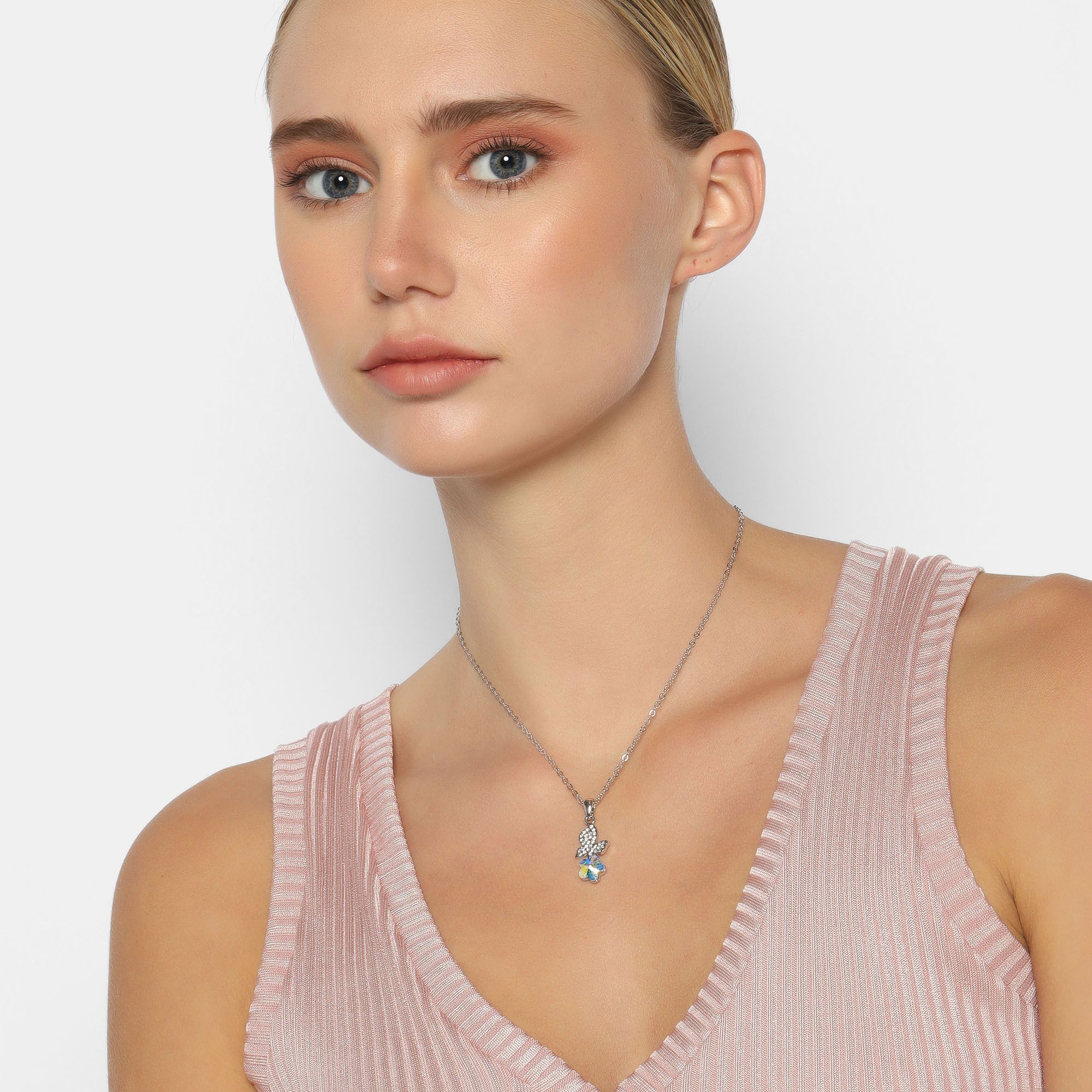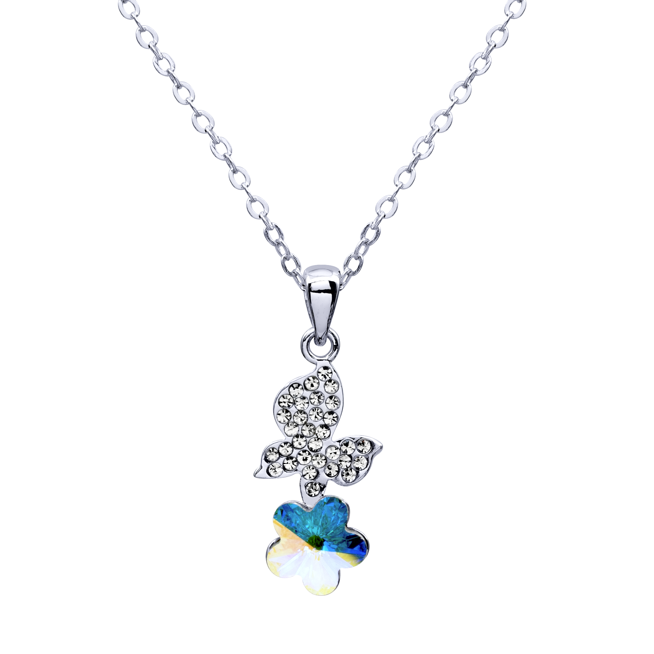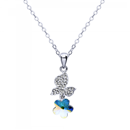 Dije con cadena en baño de oro blanco de 18 quilates, diseño de mariposa y flor con cristal corte brillante en color tornasol e incrustación de cristales en color blanco.