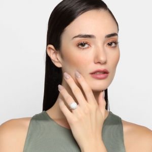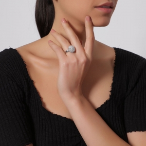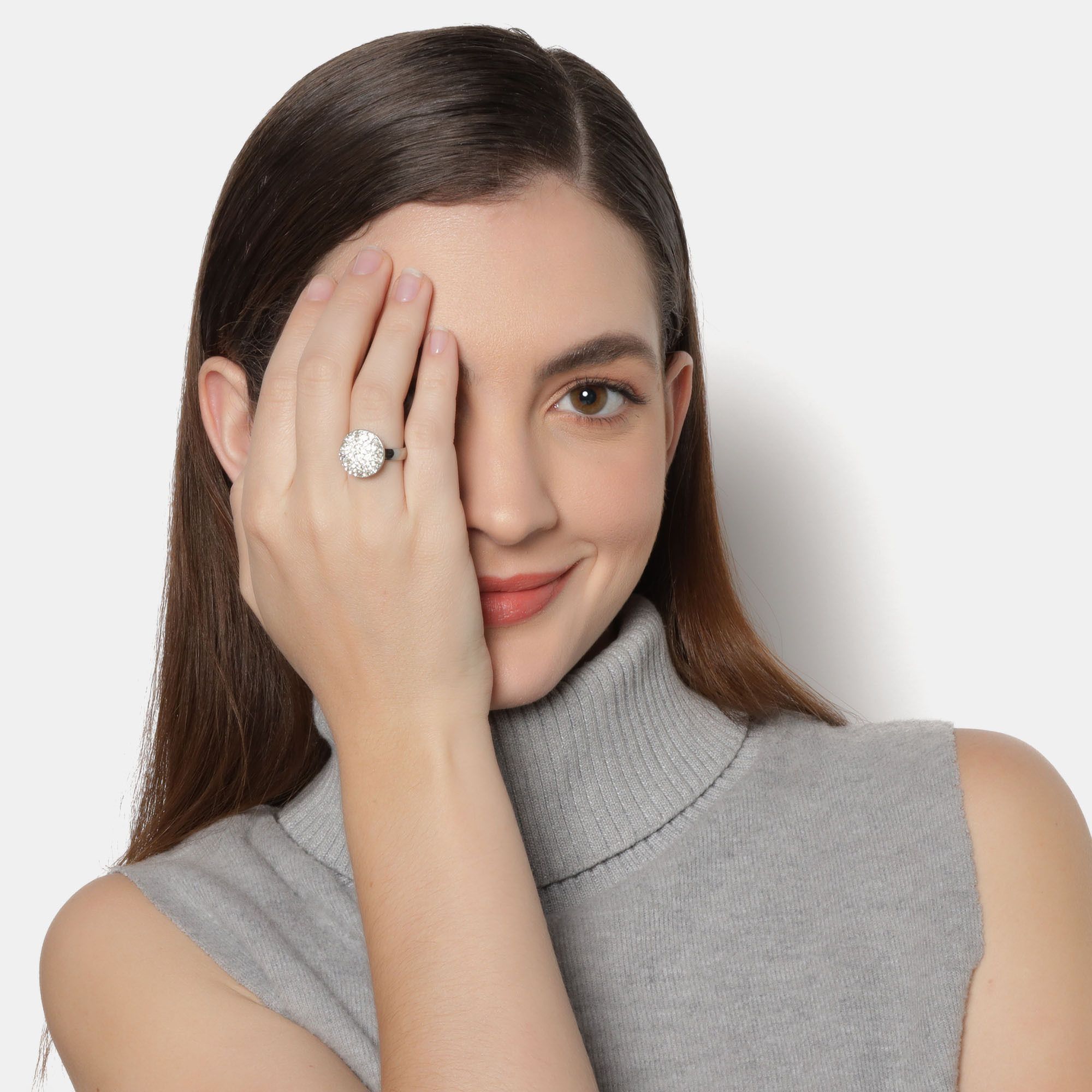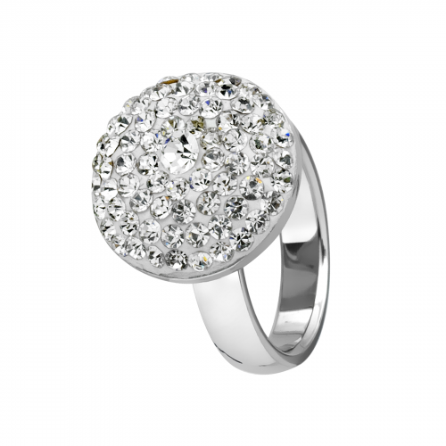 Elegante anillo en acero inoxidable, diseño de círculo, con fondo blanco, cristal blanco corte brillante e incrustaciones de cristales en color blanco.