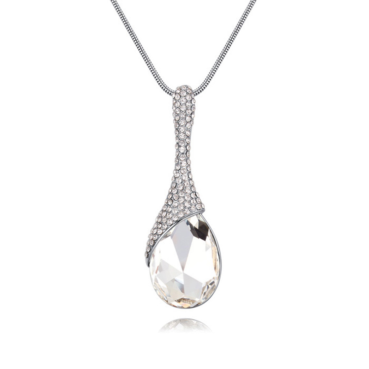 Collar en baño de oro blanco de 18 quilates, diseño de gota con cristal blanco corte pera e incrustaciones de cristales blancos.