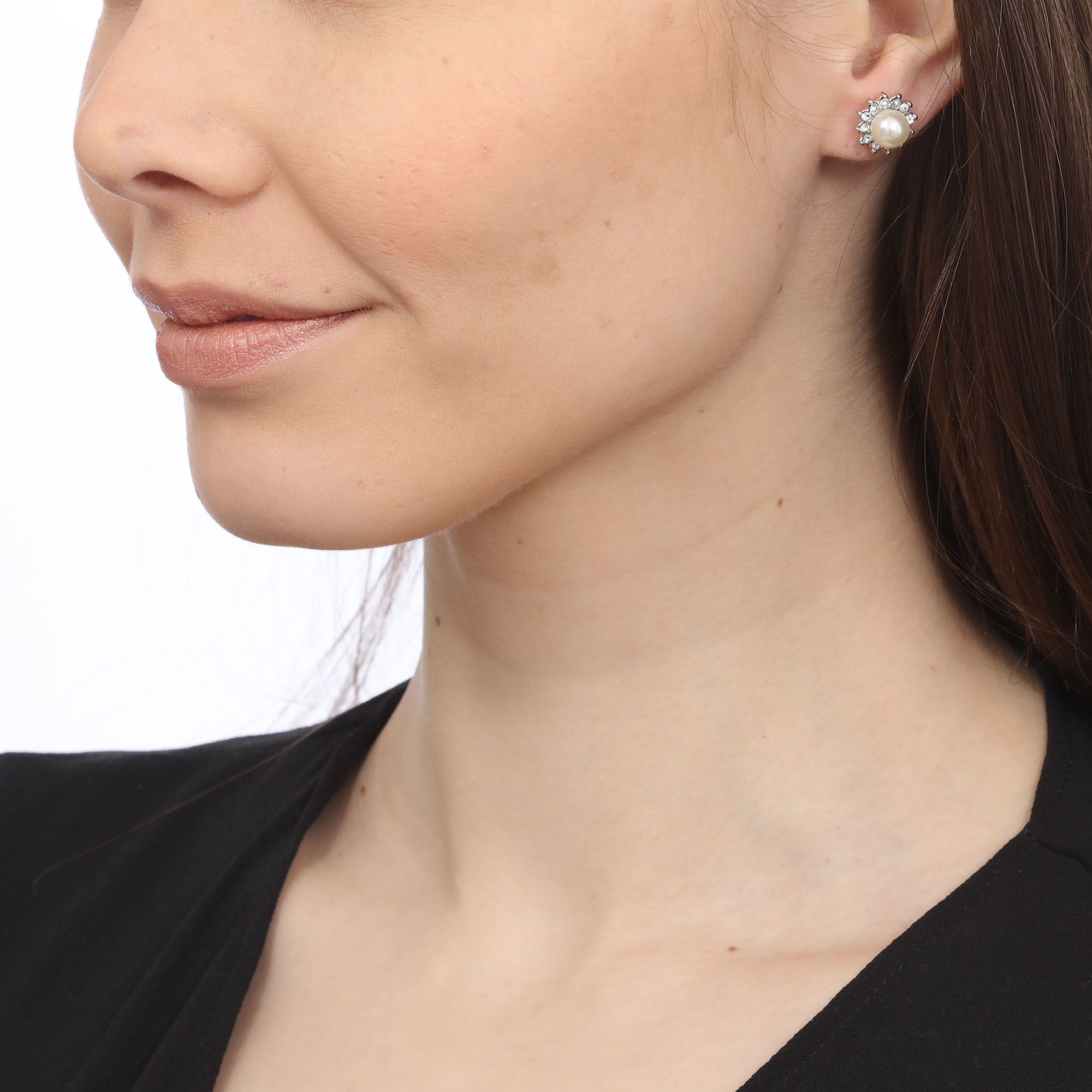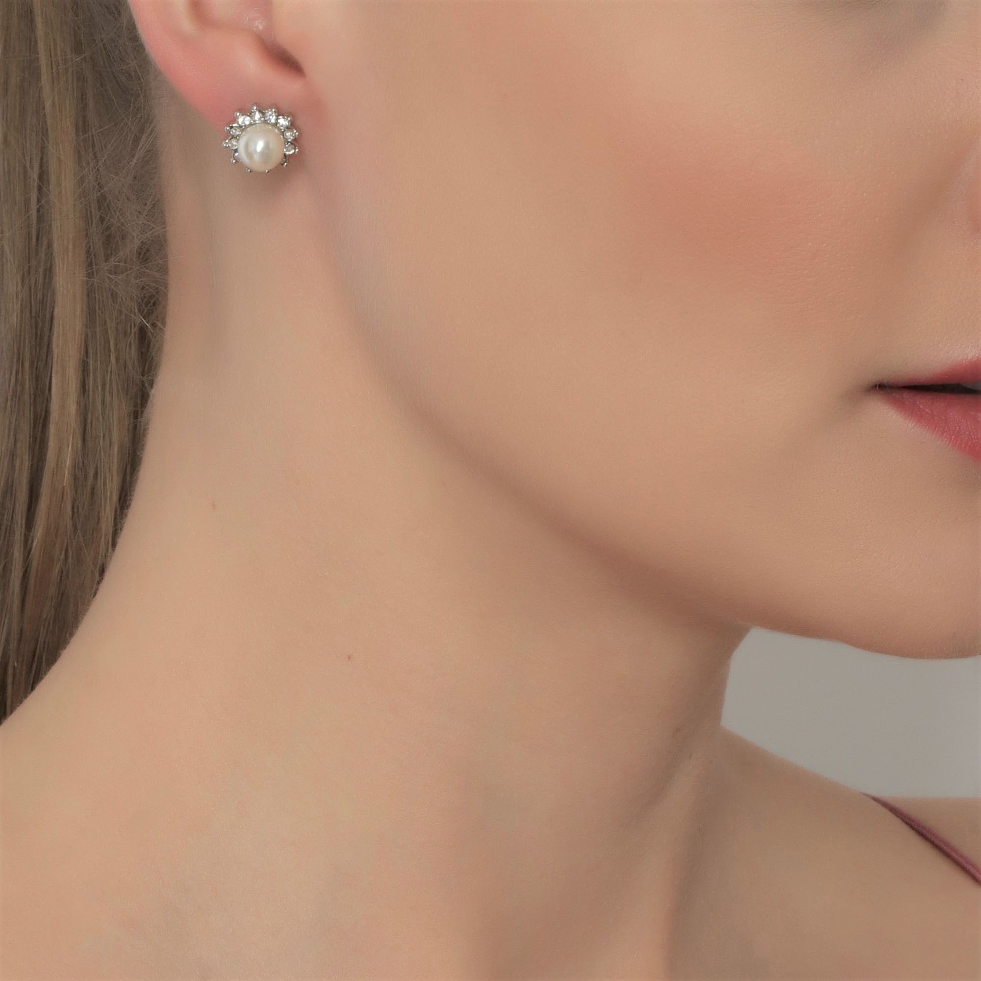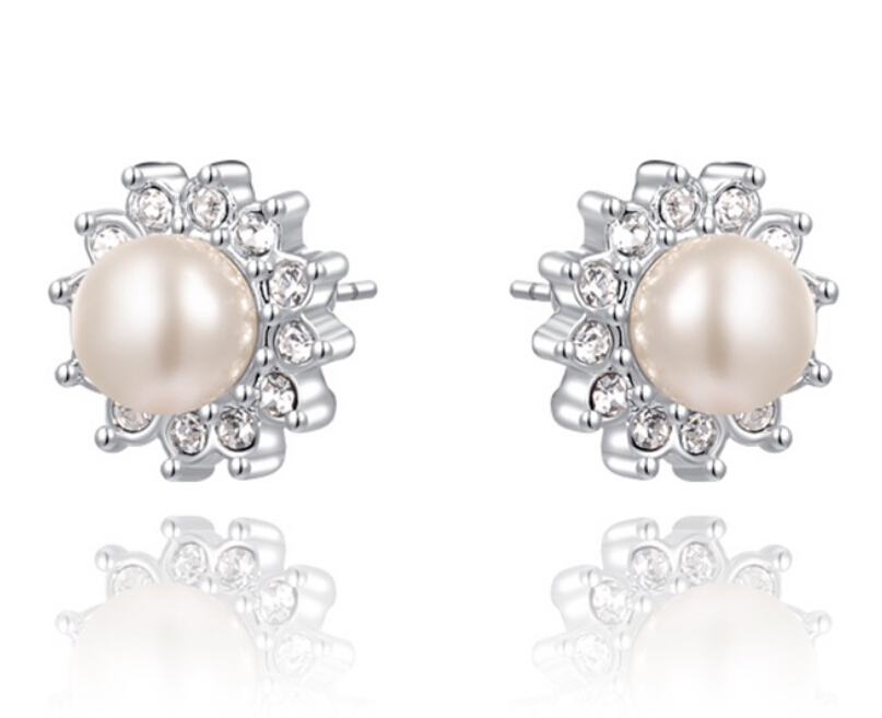 Elegantes aretes en baño de oro blanco de 18 quilates, exquisito diseño, estilo flor, con perla blanca e incrustaciones de cristales blancos.