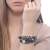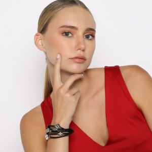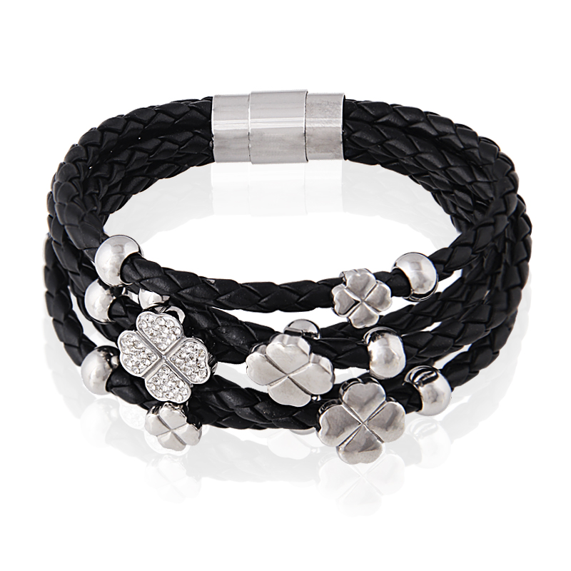 Original brazalete, con detalles en baño de oro blanco de 18 quilates, correas trenzadas de vinipiel color negro, diseño de tréboles con incrustaciones de cristales blancos y broche magnético.