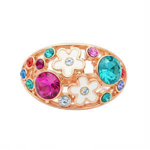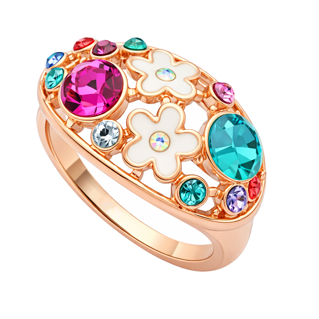 Anillo en baño de oro rosa de 18 quilates, diseño de flores, esmaltadas en tono blanco con incrustación de cristales en tonos tornasol, verde, rosa y blanco.