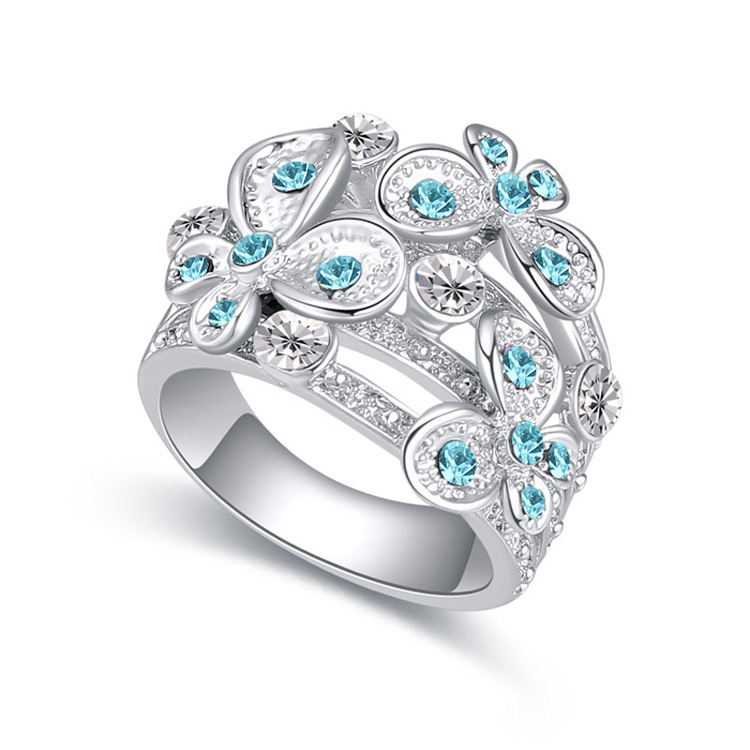 Precioso anillo, en baño de oro blanco de 18 quilates, diseño de mariposas, estilo aro triple, con incrustación de cristales en color blanco y azul.