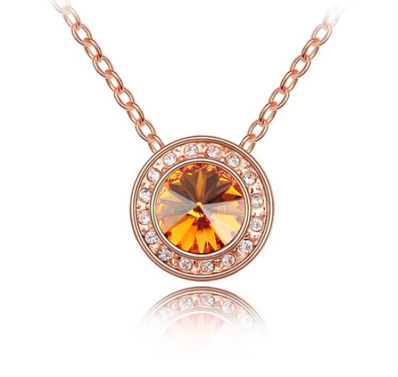 Dije con cadena en baño de oro rosa de 18 quilates, diseño circular, con cristal ámbar corte redondo e incrustaciones de cristales blancos.