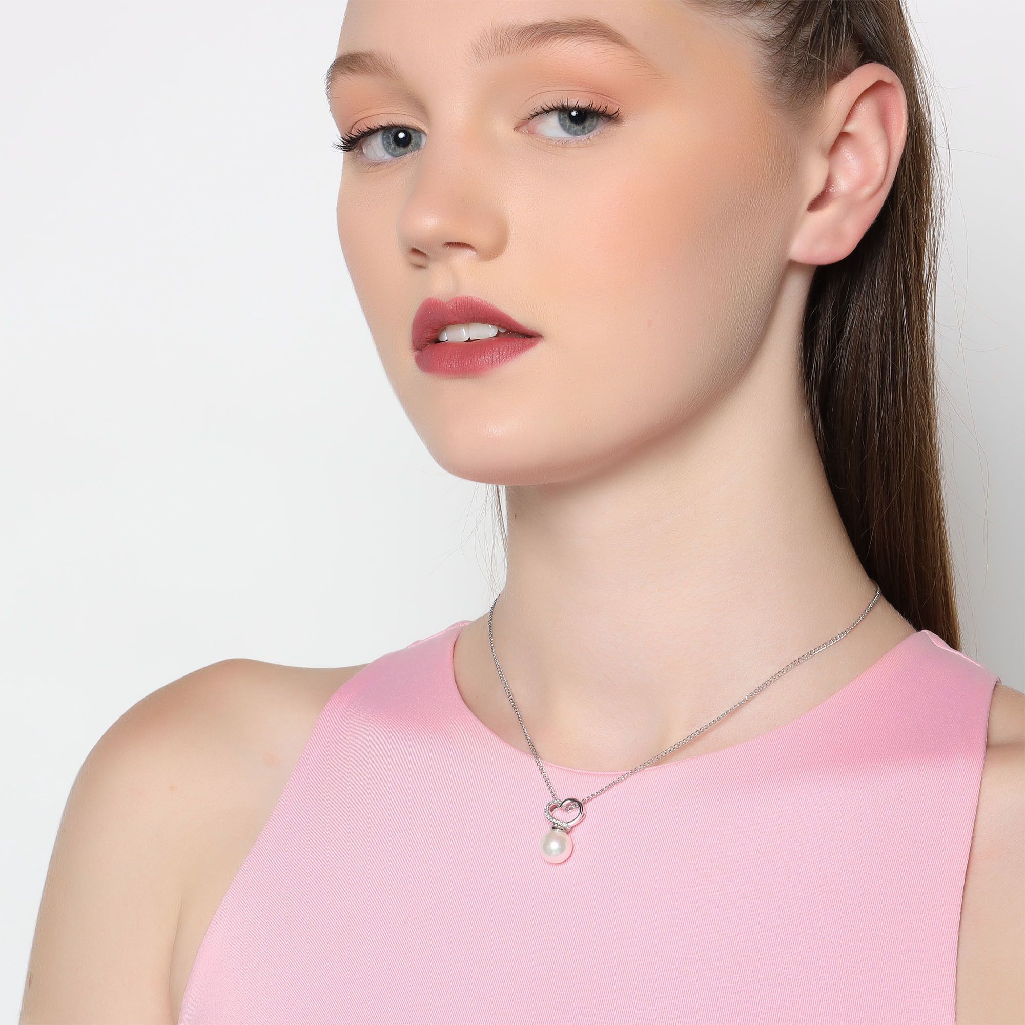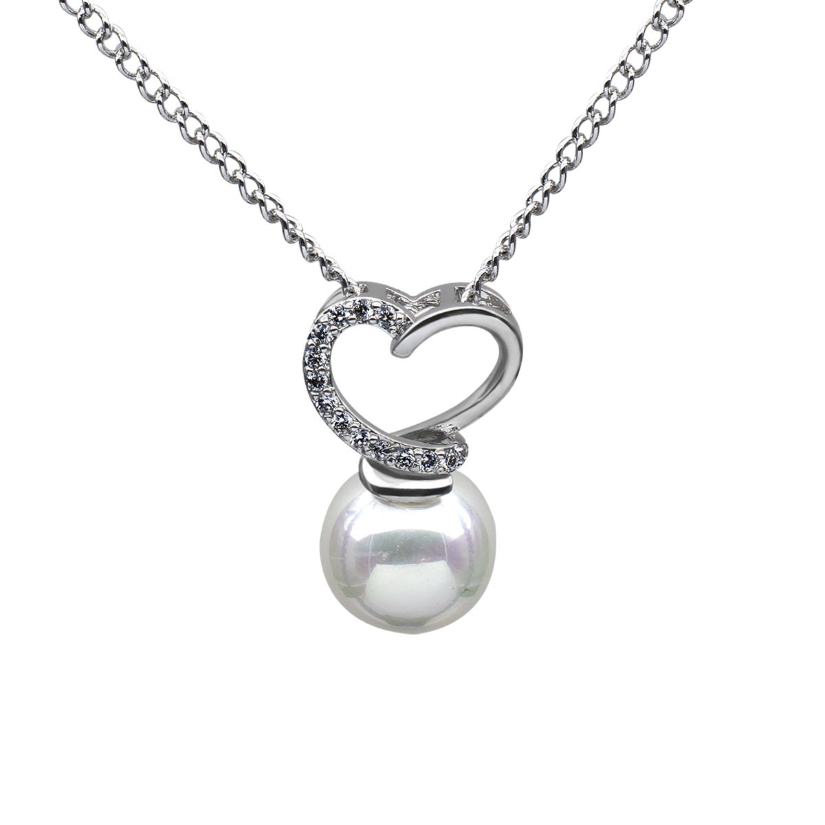 Lindo Dije en baño de oro blanco de 18 quilates, diseño de corazón con detalle de perla e incrustación de cristales en color blanco.