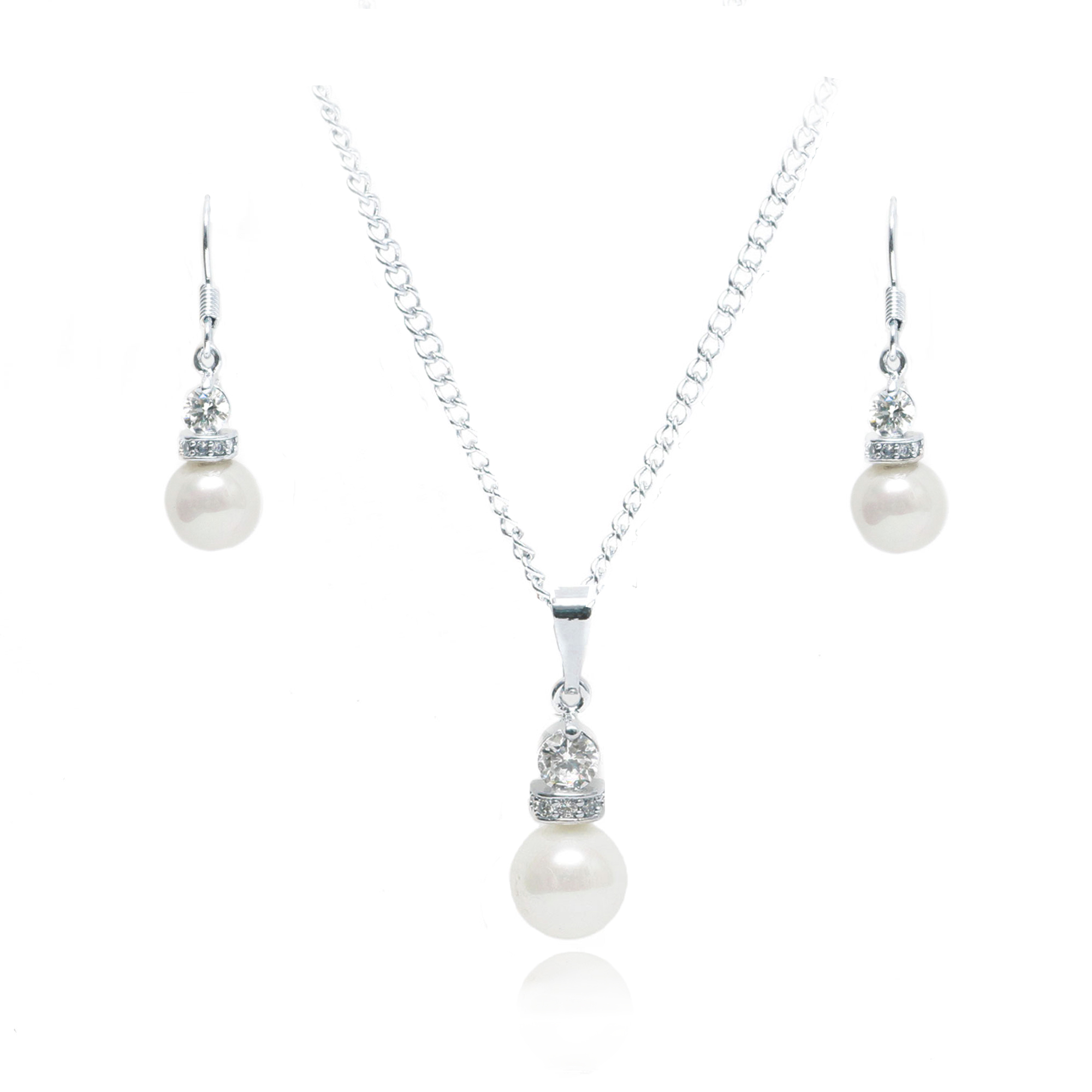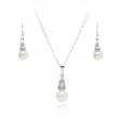 Juego de aretes y dije en baño de oro blanco de 18 quilates, diseño de perla con incrustación de cristales en color blanco.
