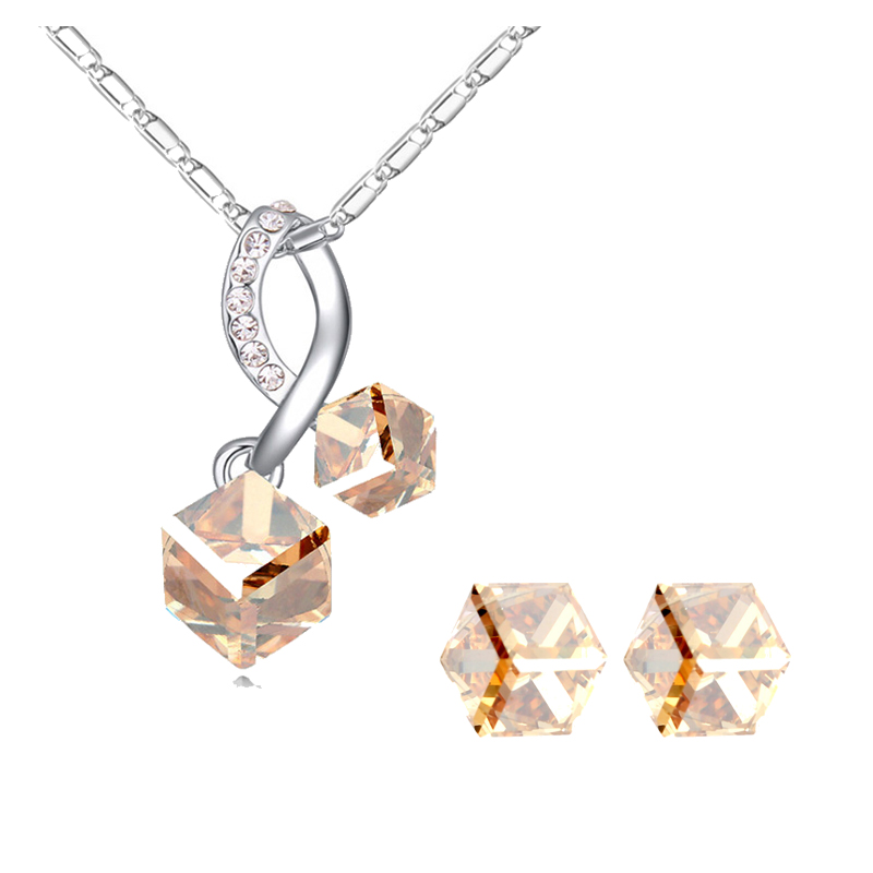 Hermoso set de aretes y dije con cadena en baño de oro blanco de 18 quilates, original diseño con cubo de cristales en color ámbar e incrustaciones de cristales en color blanco.