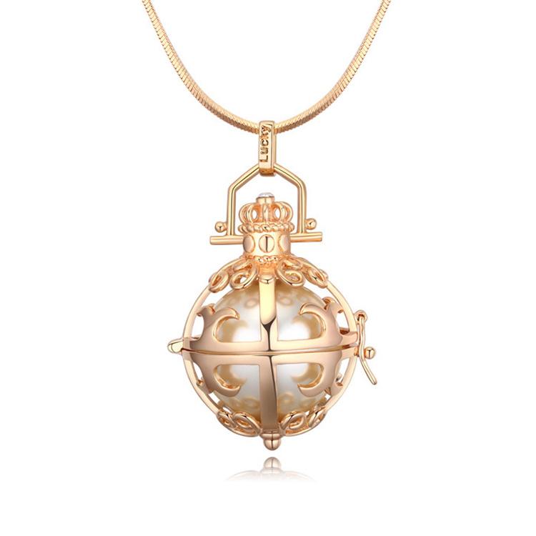 Collar para Sweater en baño de oro amarillo de 18 quilates, estilo filigrana con perla blanca de cristal.