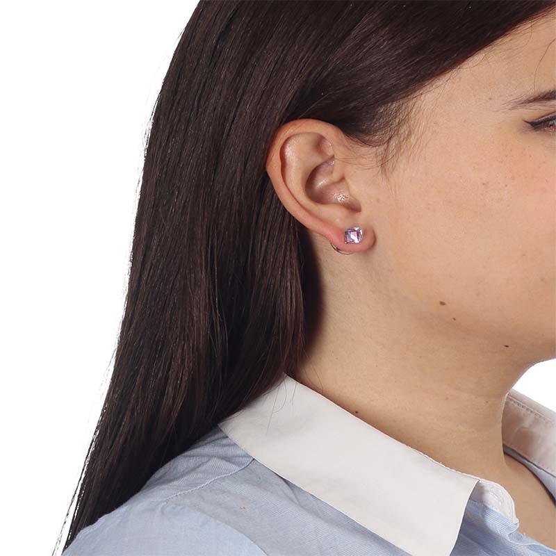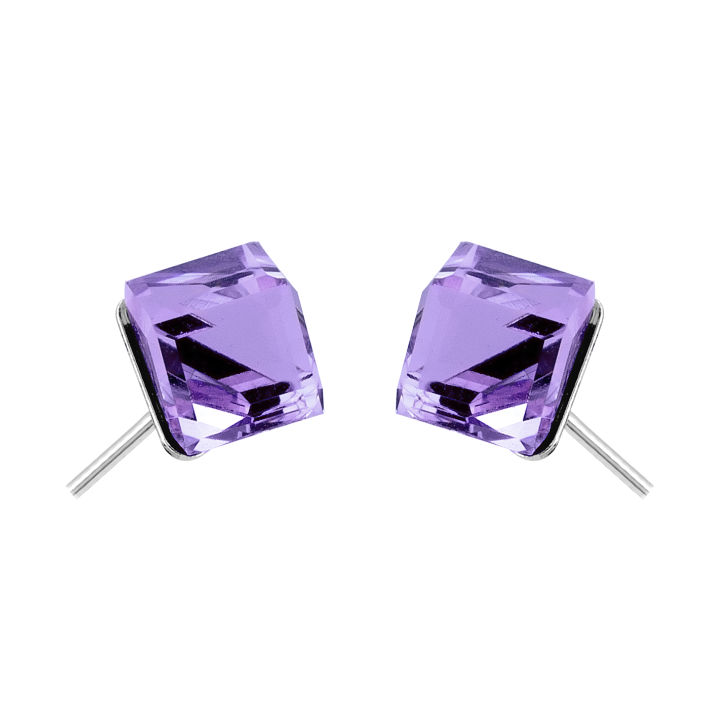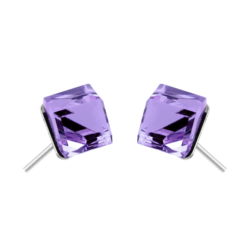 Hermosos Aretes en baño de oro blanco de 18 quilates, original diseño, con cubo de cristal en color morado. Fabricado en una estructura de aleación de platino con rodio sin níquel