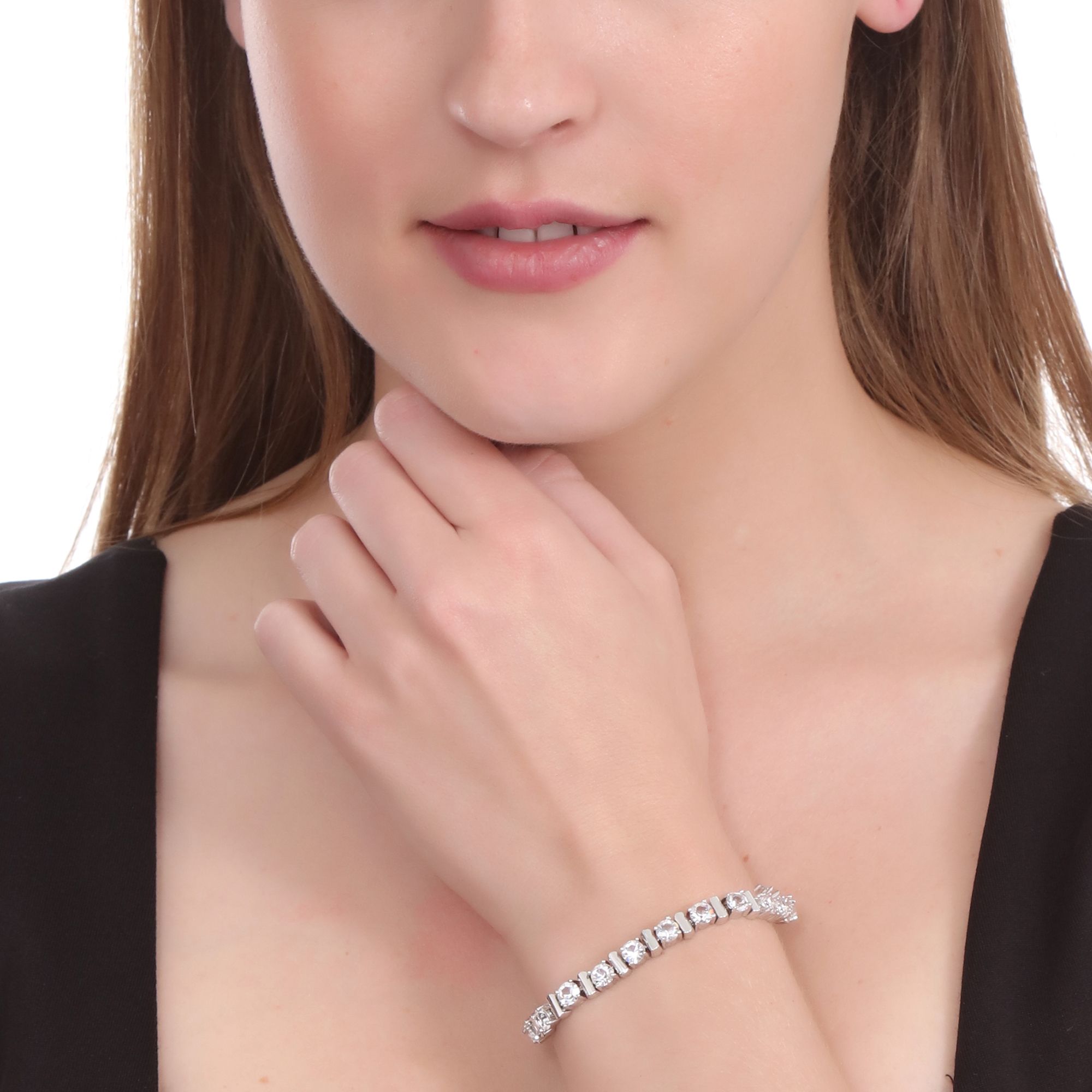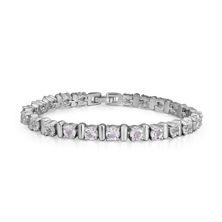 Elegante pulsera, en baño de oro blanco de 18 quilates, lindo diseño, con incrustaciones de cristales en color blanco corte billante.