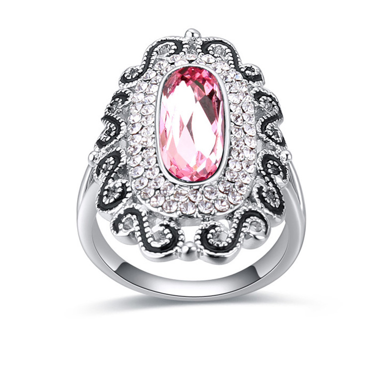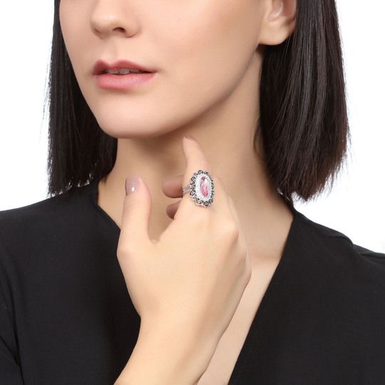 Hermoso anillo, en baño de oro blanco de 18 quilates, diseño ovalado, con cristal rosa corte oval, grecas en relieve color negro e incrustaciones de cristales blancos.