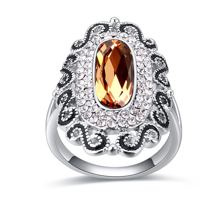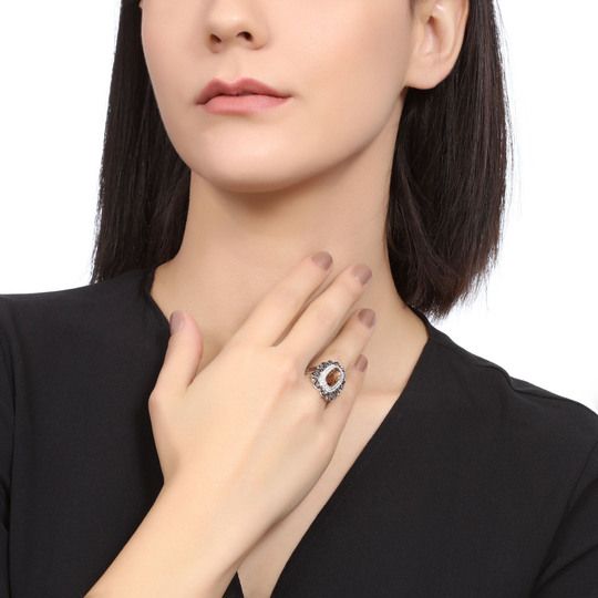 Precioso anillo en baño de oro blanco de 18 quilates, diseño ovalado, con cristal ámbar corte oval, grecas en relieve color negro e incrustaciones de cristales blancos.