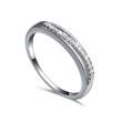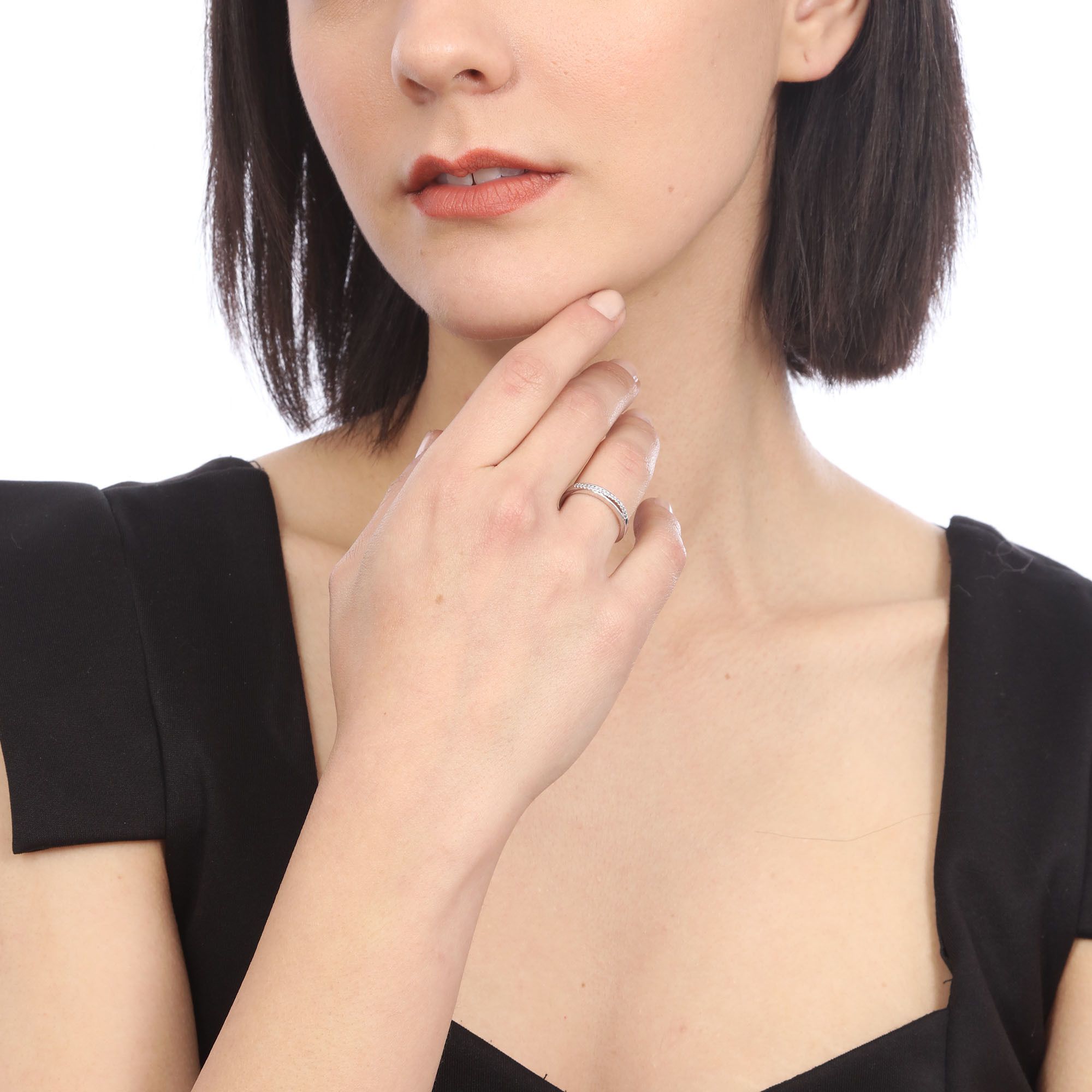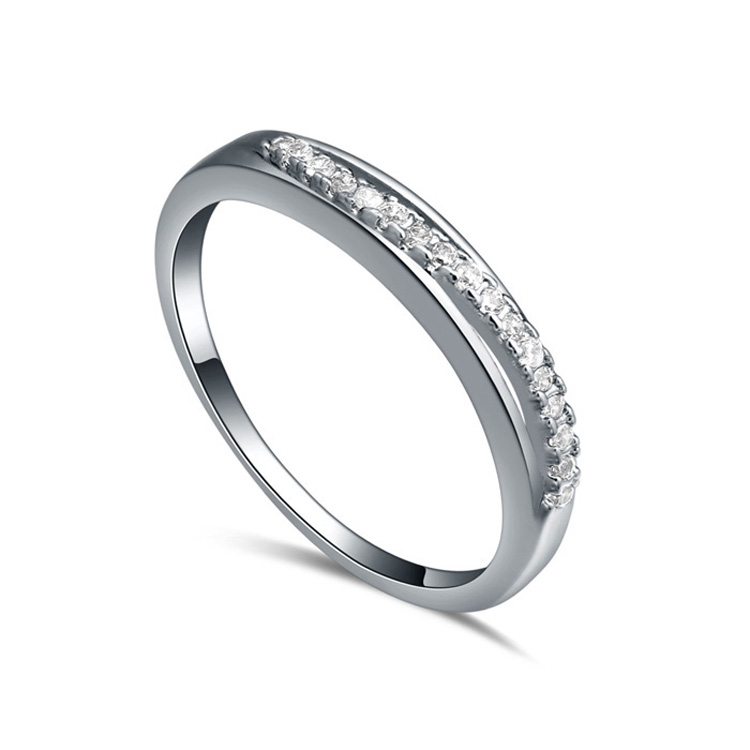 Delicado anillo en baño de oro blanco de 18 quilates, diseño de onda, con incrustación de cristales en color blanco.