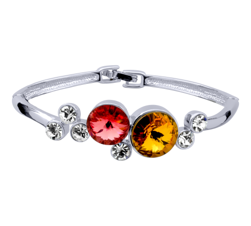 Pulsera en baño de oro blanco de 18 quilates, fino diseño de círculos, con cristales ámbar y naranja corte billante e incrustaciones de cristales blancos.