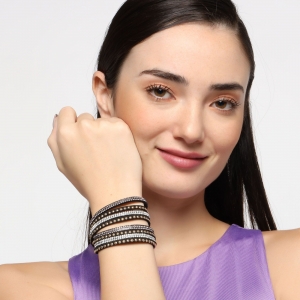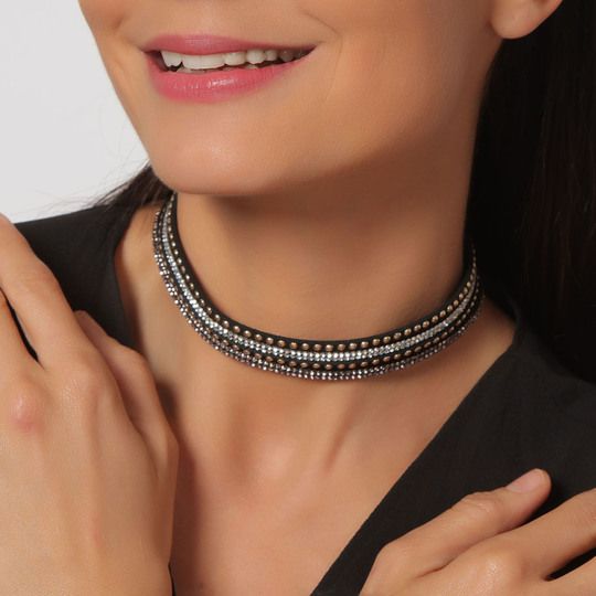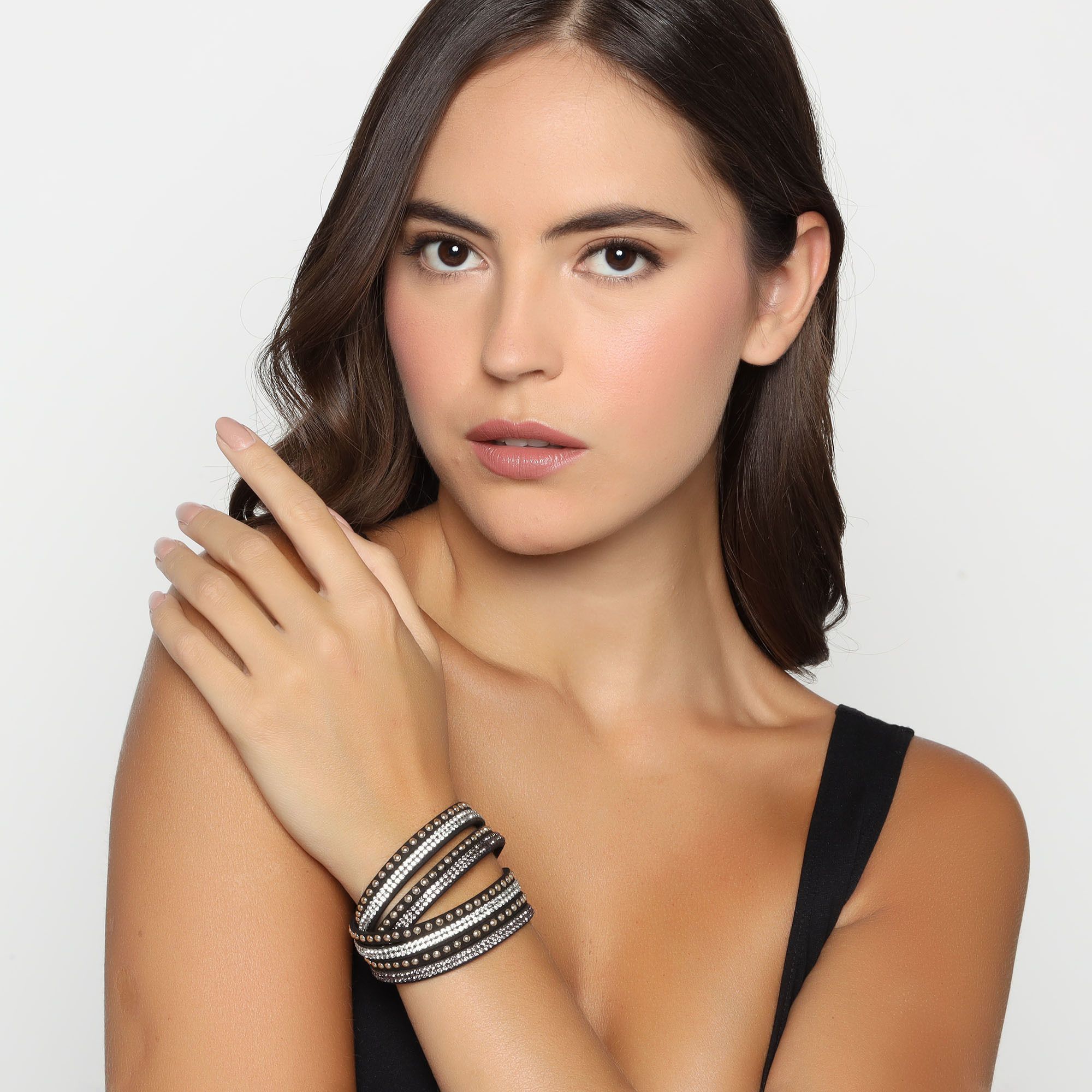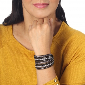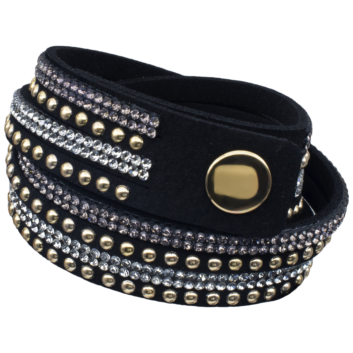 Original brazalete de gamuza color negro, con estoperoles dorados y tiras de cristales color negro y blanco.