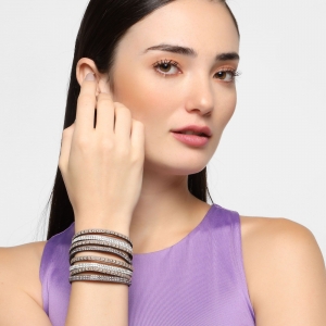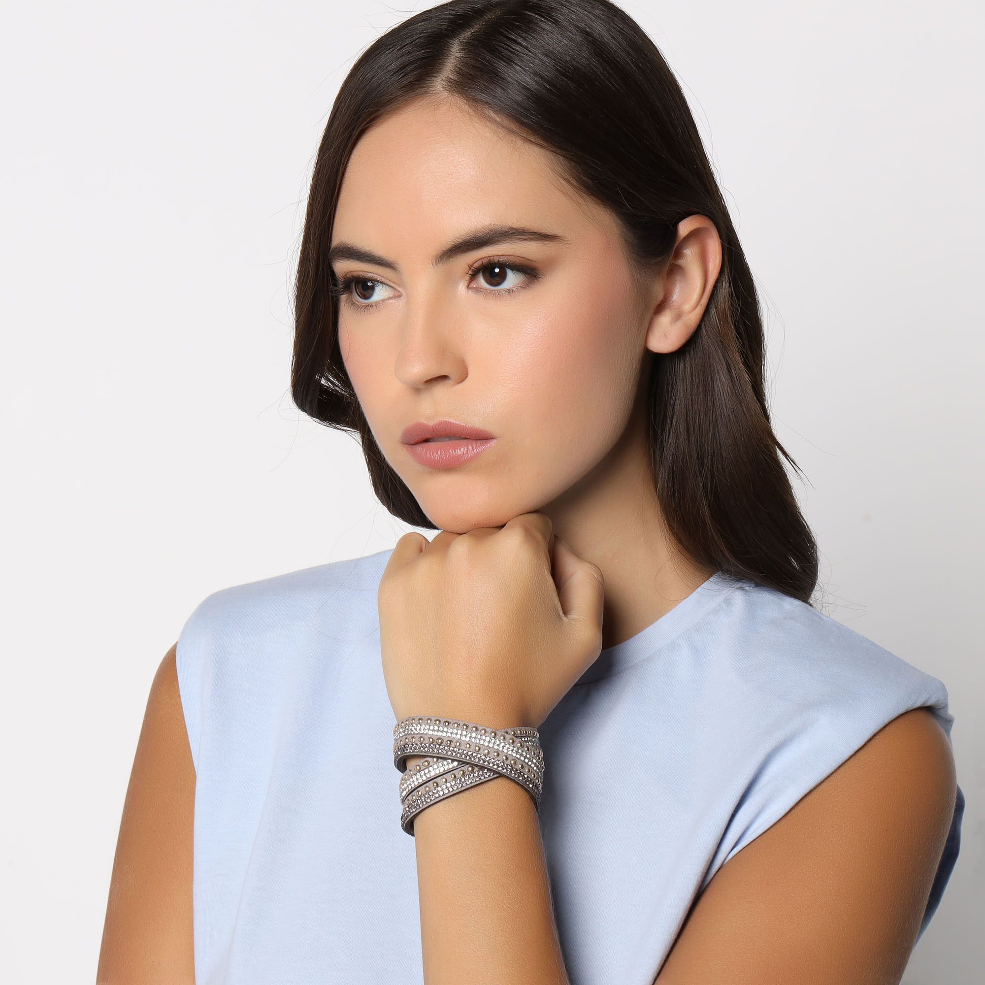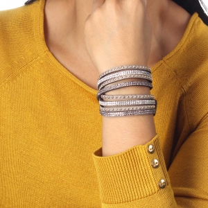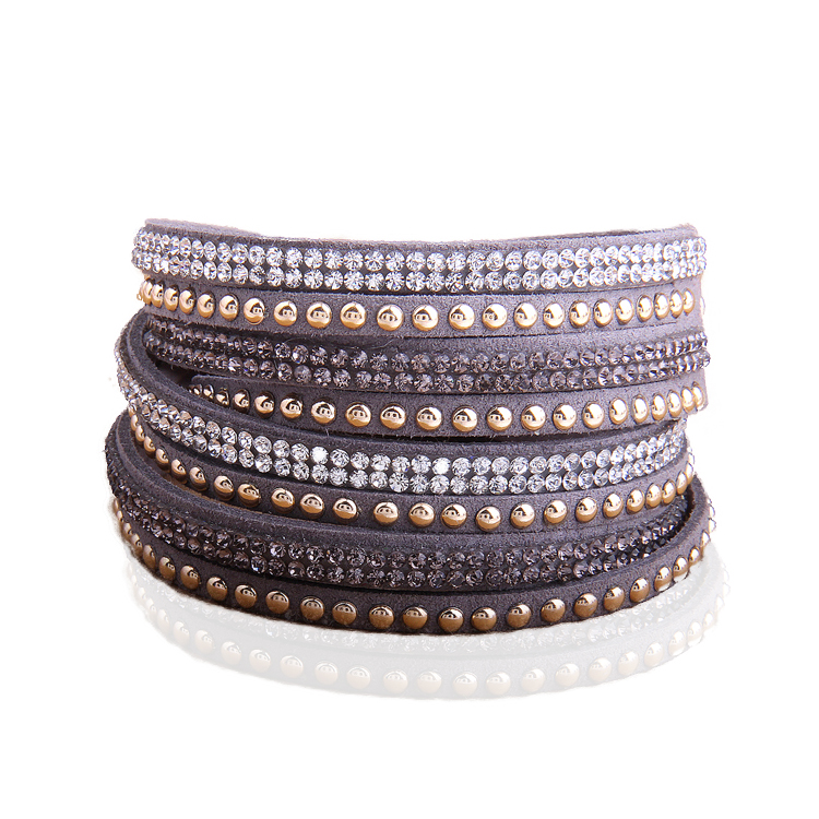 Original brazalete de gamuza color gris, con estoperoles dorados y tiras de cristales color oxford y blanco.