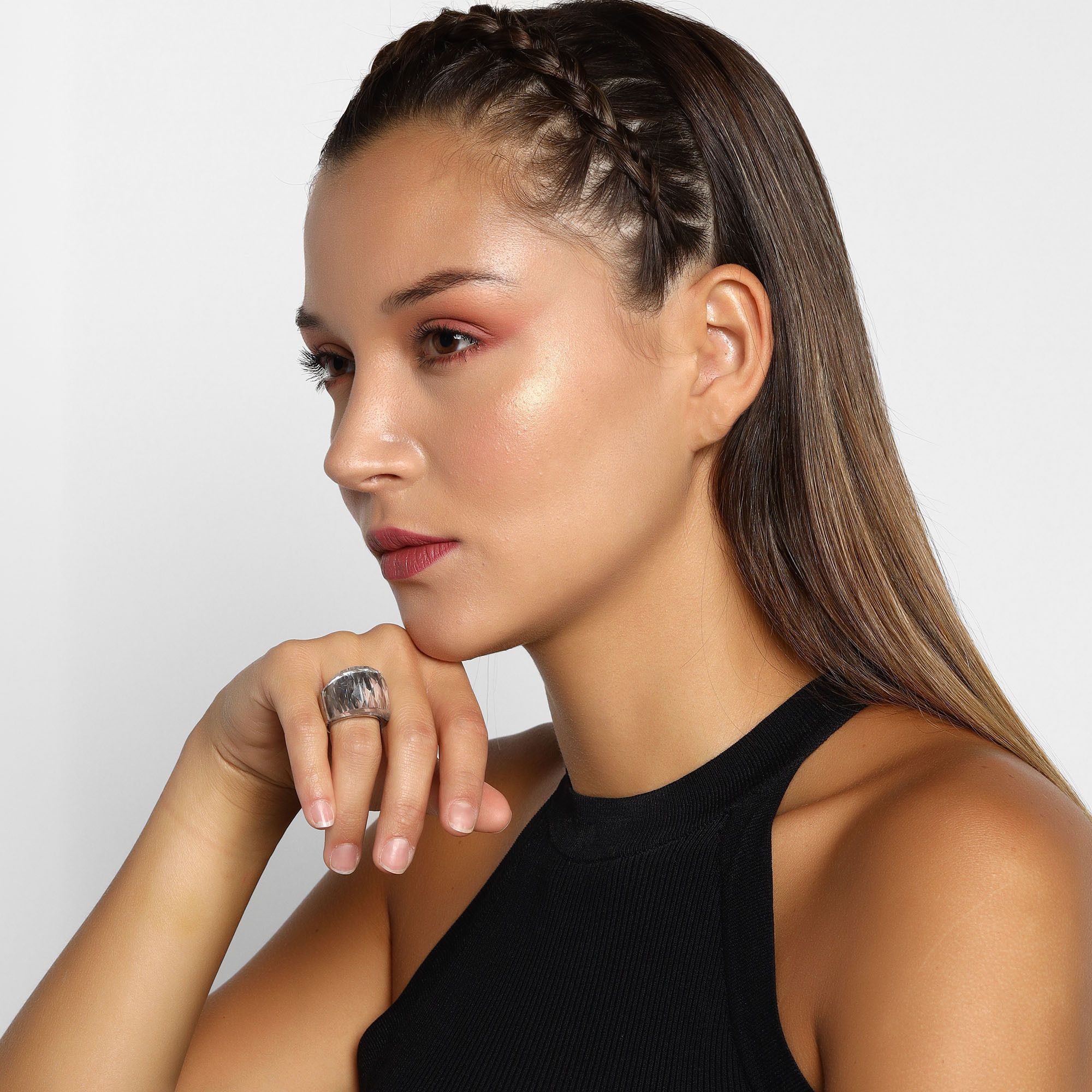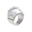 Elegante anillo en acero inoxidable, diseño rectangular, con cristal facetado en color blanco.