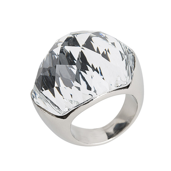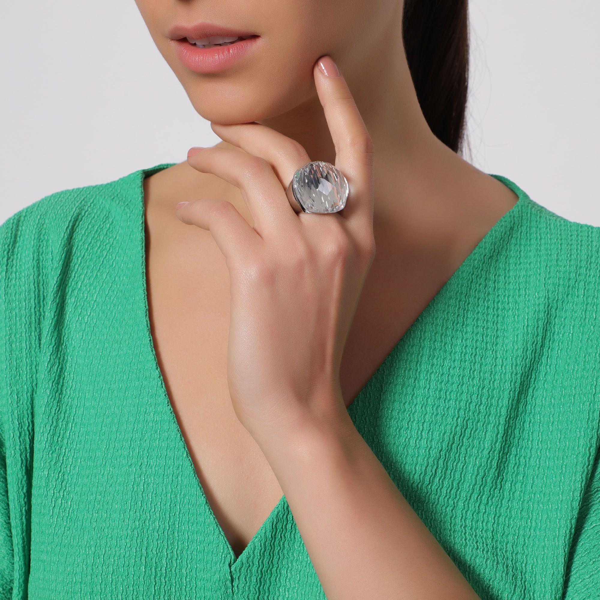 Elegante anillo, con baño de oro blanco de 18 quilates, estilo convexo, con cristal facetado en color blanco.