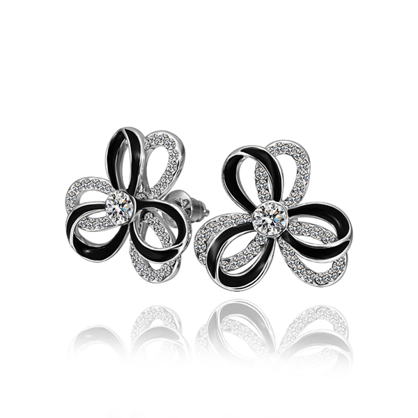Hermosos aretes en baño de oro blanco de 18 quilates, diseño de flor, con esmaltado color negro e incrustaciones de cristales blancos.