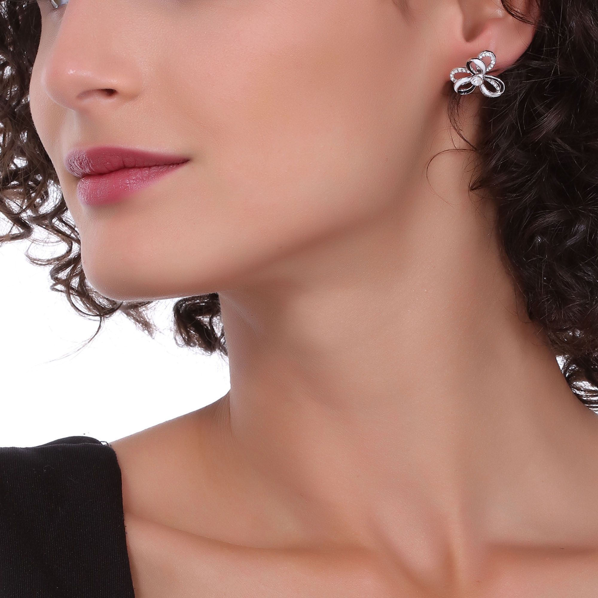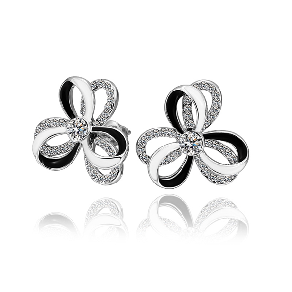 Hermosos Aretes en baño de oro blanco de 18 quilates, diseño de flor, con detalles esmaltados en blanco y negro e incrustación de cristales blancos. Fabricado en una estructura de aleación de platino con rodio sin níquel