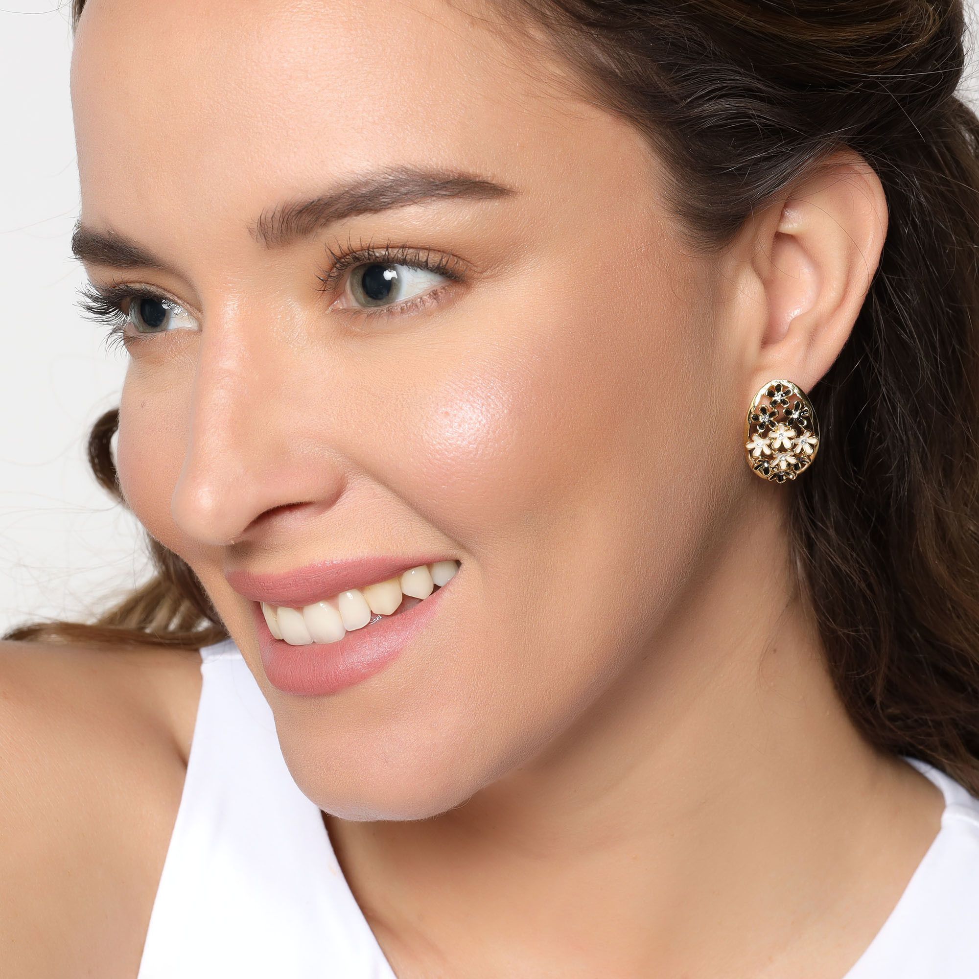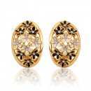 Preciosos aretes en baño de oro amarillo de 18 quilates, diseño oval, con flores esmaltadas en color blanco y negro e incrustación de cristales blancos.