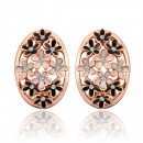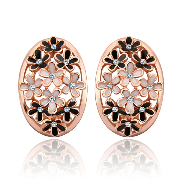Preciosos aretes en baño de oro rosa de 18 quilates, diseño oval, con flores esmaltadas en color blanco y negro e incrustación de cristales blancos.