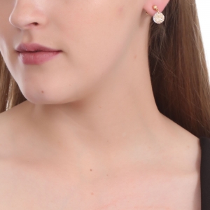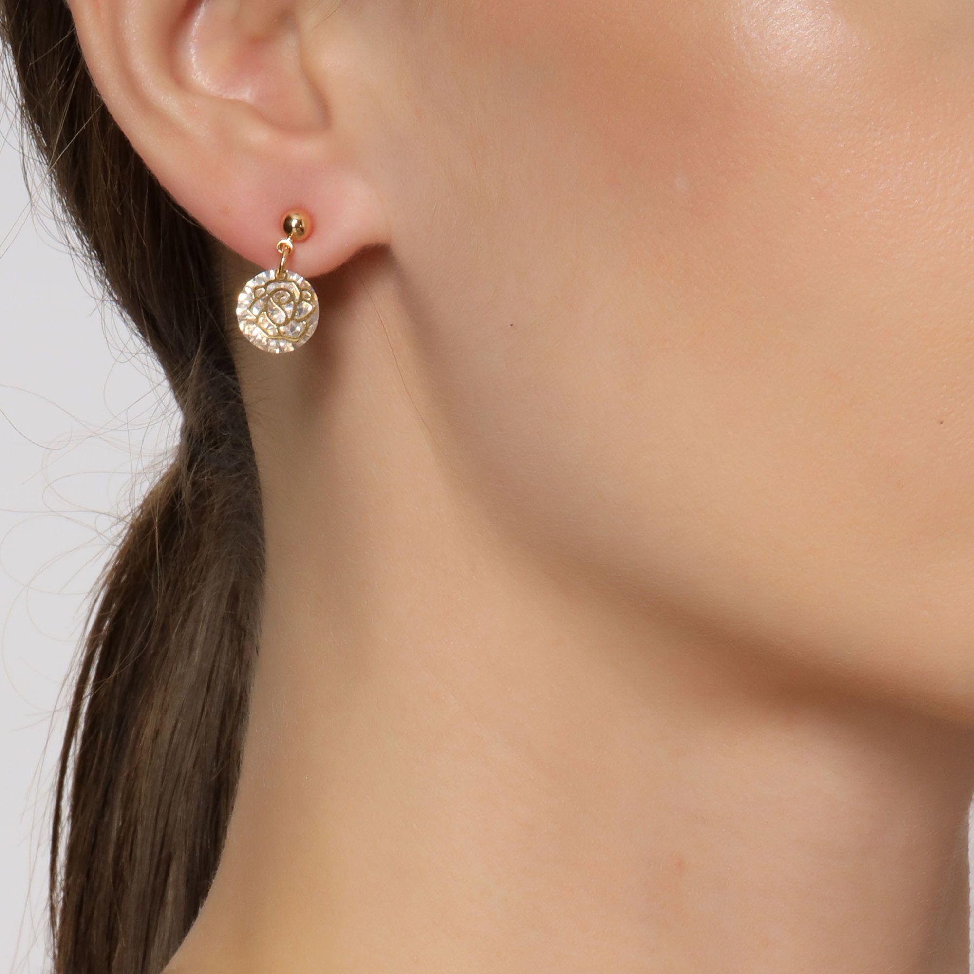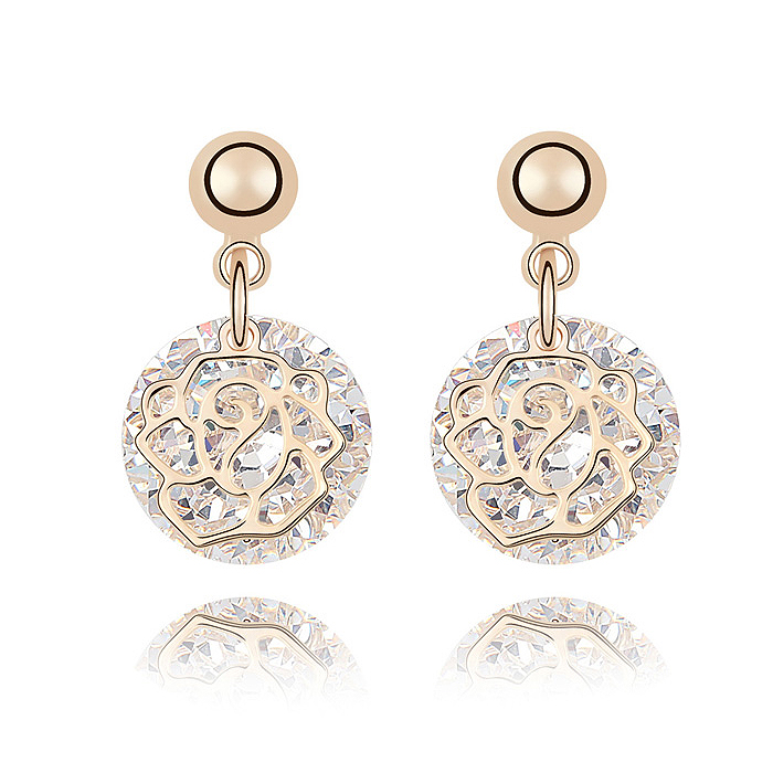 Elegantes aretes en baño de oro amarillo de 18 quilates, diseño de rosa, estilo calado, con cristal blanco corte brillante.