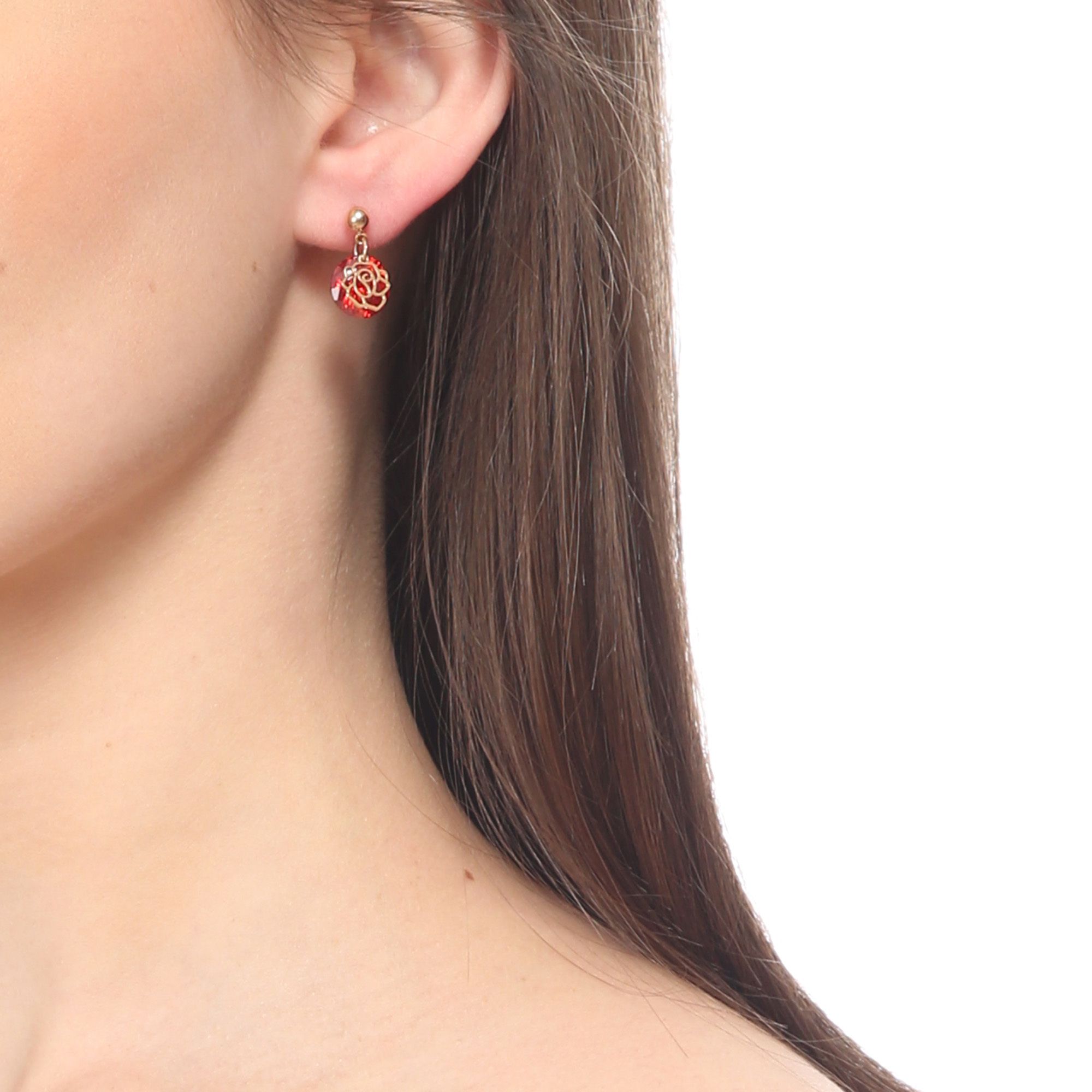 Elegantes aretes en baño de oro amarillo de 18 quilates, diseño de rosa, estilo calado, con cristal rojo corte brillante.