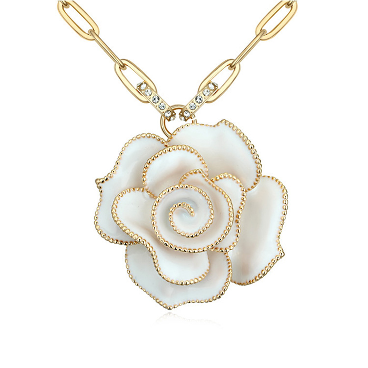 Collar en baño de oro amarillo de 18 quilates, diseño de rosa esmaltada en color blanco con incrustaciones de cristales blancos.