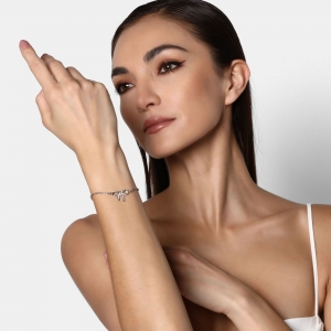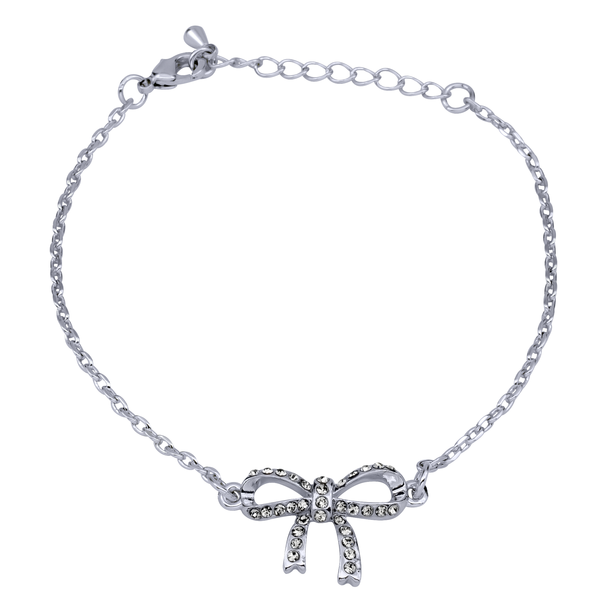 Hermosa pulsera, en baño de oro blanco de 18 quilates, tierno diseño de moño, con incrustaciones de cristales en color blanco.