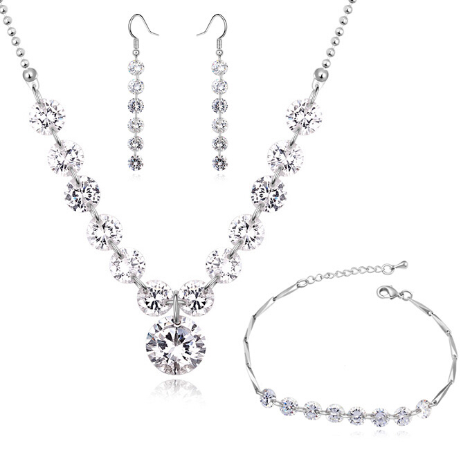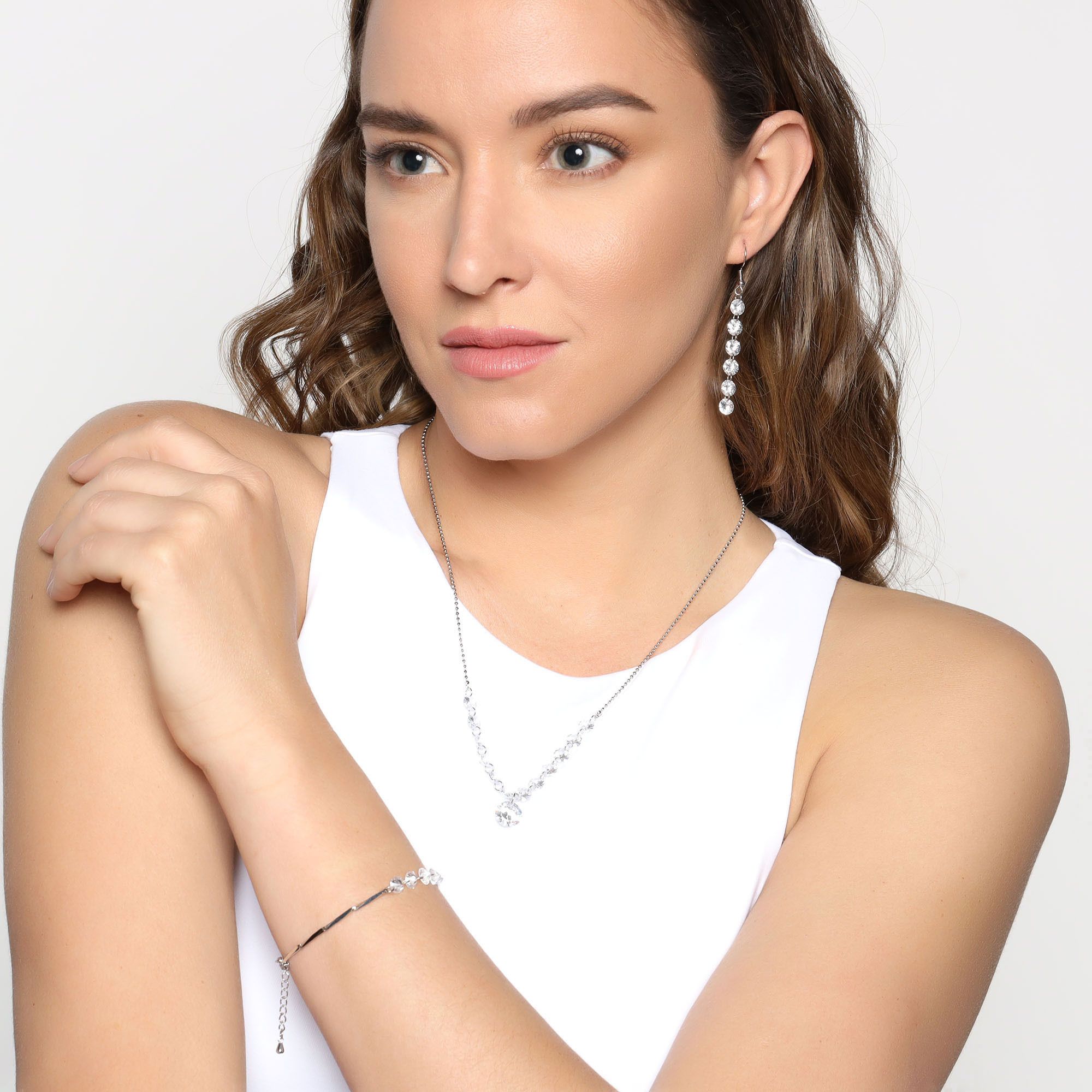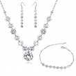 Juego de aretes, pulsera y dije en baño de oro blanco de 18 quilates, diseño con pequeños cristales en color blanco.