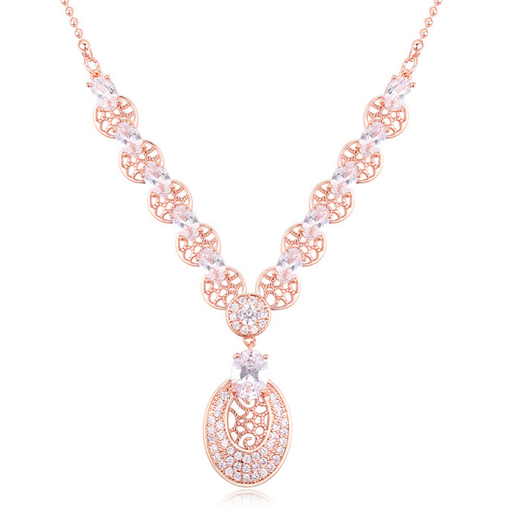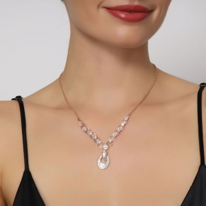 Collar en baño de oro rosa de 18 quilates, diseño ovalado, con grecas caladas e incrustaciones de cristales blancos.