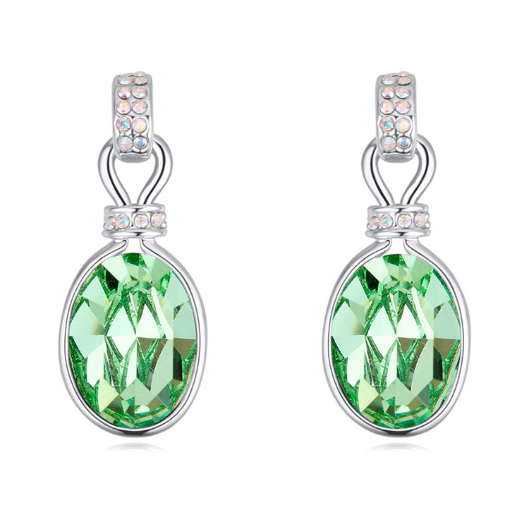 Lindos aretes en baño de oro blanco de 18 quilates, fino diseño, con cristal verde corte oval e incrustaciones de cristales en color tornasol.