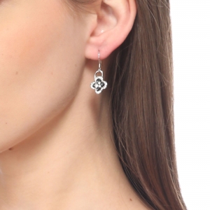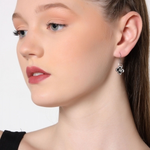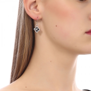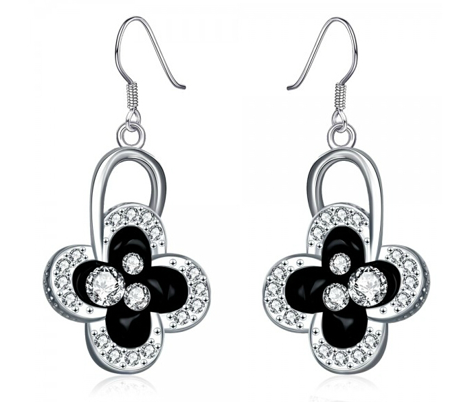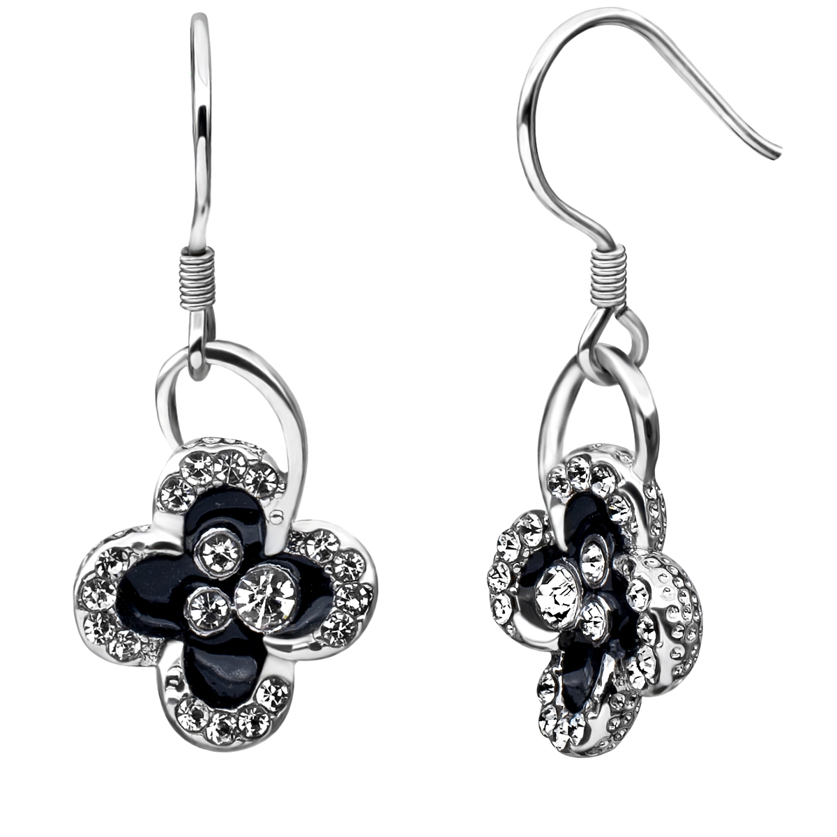 Aretes en baño de oro blanco de 18 quilates, diseño de flor, con esmaltado color negro e incrustación de cristales blancos. Fabricado en una estructura de aleación de platino con rodio sin níquel
