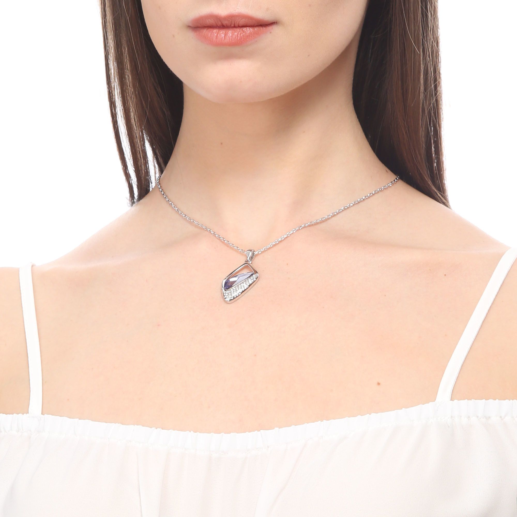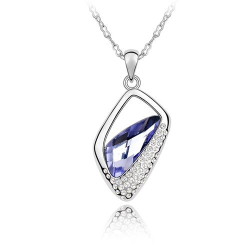 Dije con cadena en baño de oro blanco de 18 quilates, con incrustación de cristales en color morado. Fabricado en una estructura de aleación de platino con rodio sin níquel 1. joyería Hipoalergénica. 2. Incluye cajita de joyería. 3. Garantía de 30 días por defectos de fabrica.