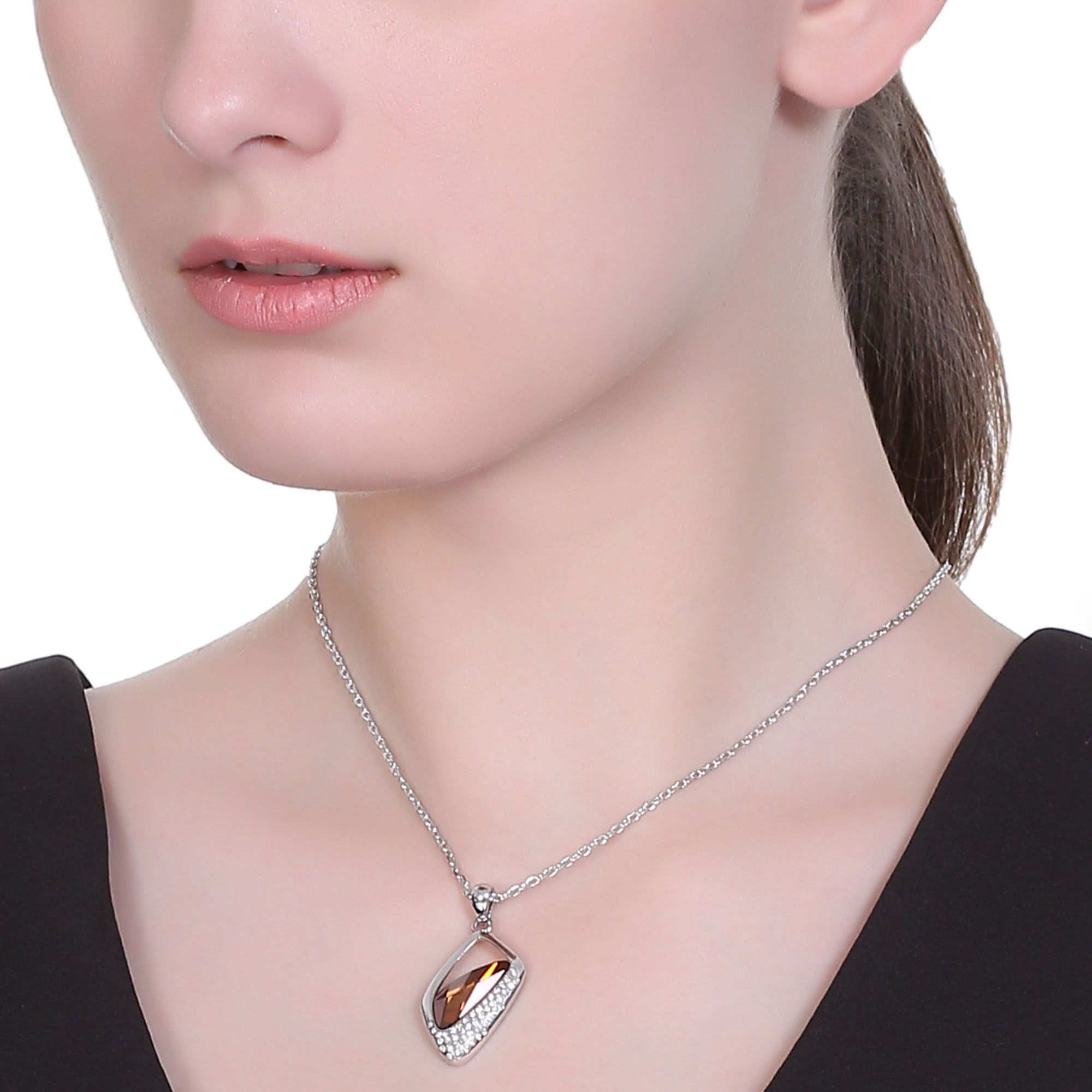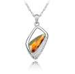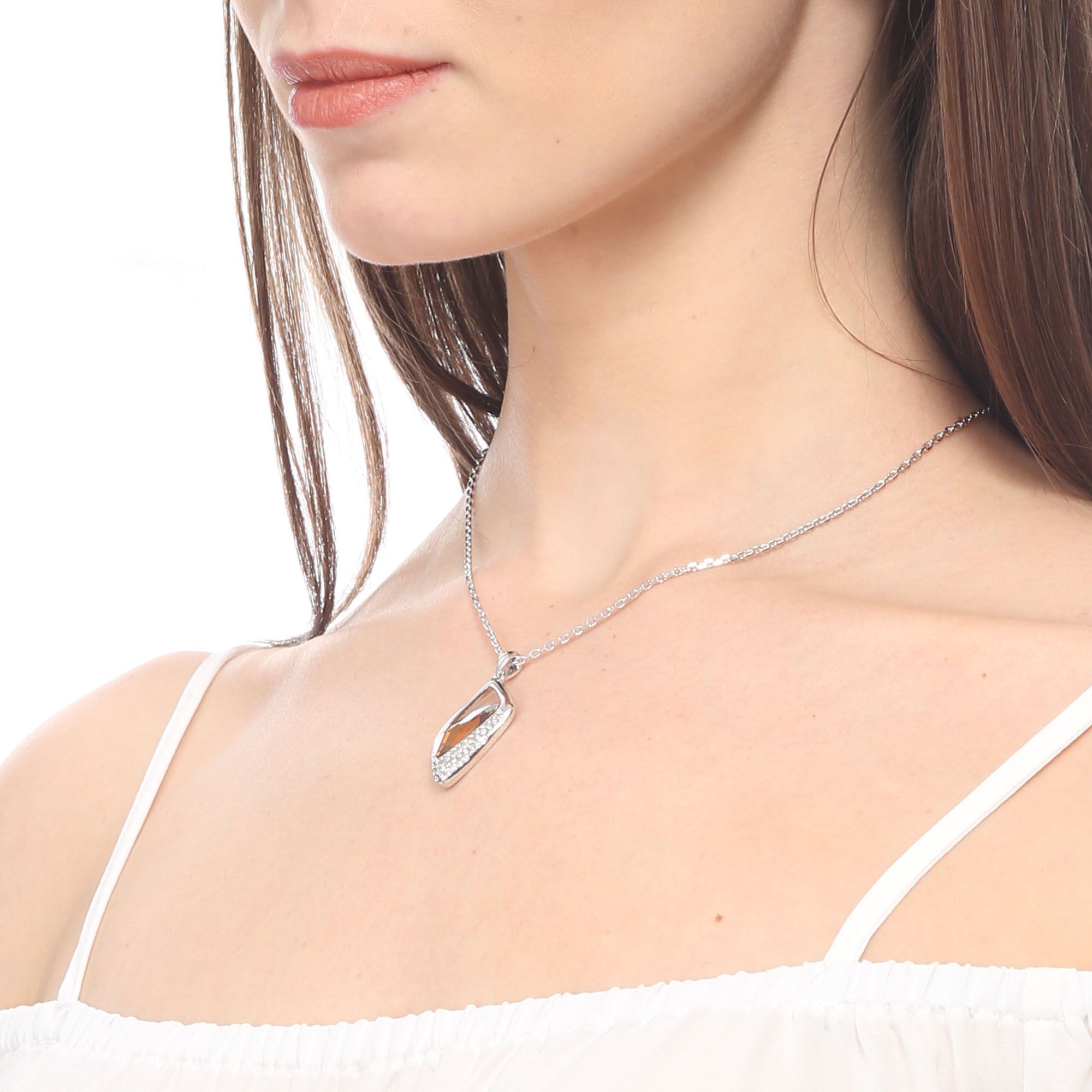 Dije con cadena en baño de oro blanco de 18 quilates, diseño moderno con detalle de cristal en forma de triángulo corte briolette en color ámbar e incrustación de cristales en color blanco.