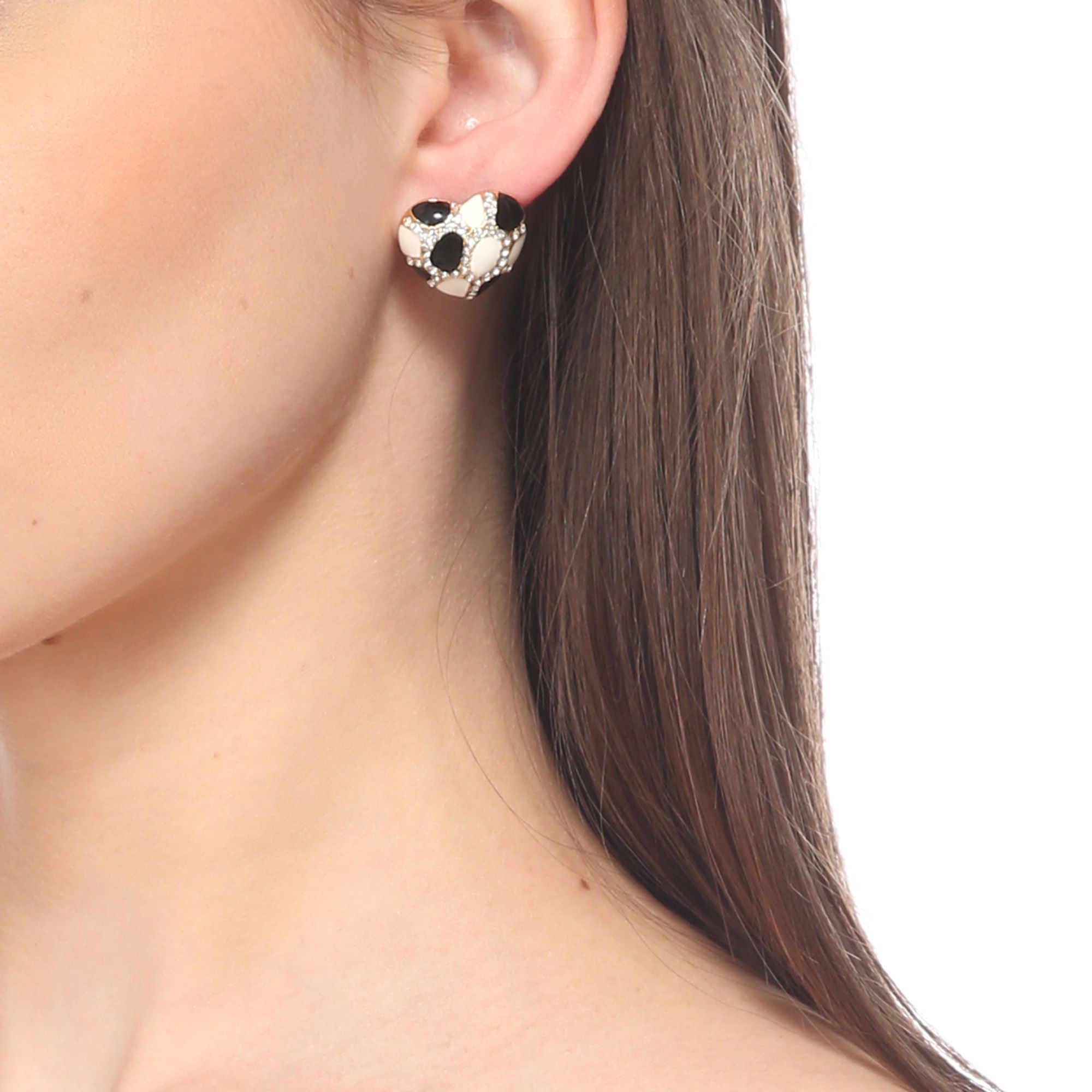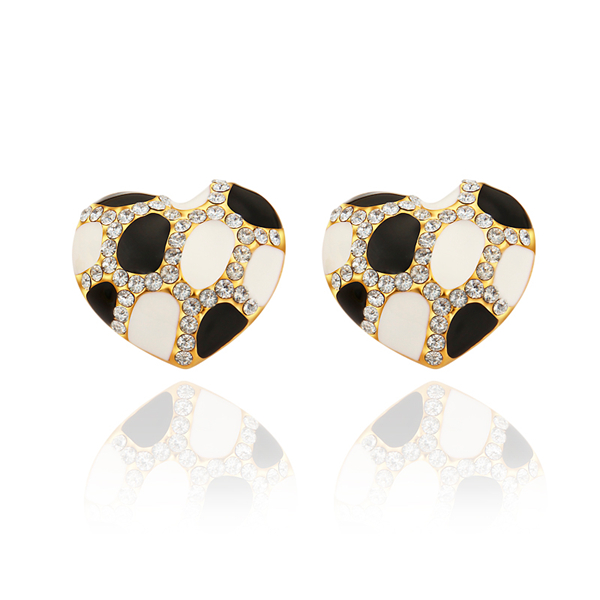 Delicados Aretes en baño de oro amarillo de 18 quilates, diseño de corazón, con esmaltado blanco y negro e incrustación de cristales en color blanco. Fabricado en una estructura de aleación de platino con rodio sin níquel.
