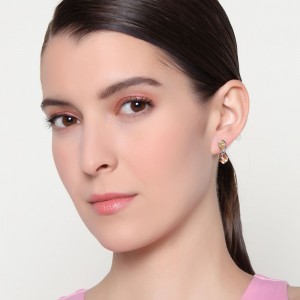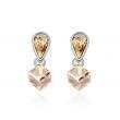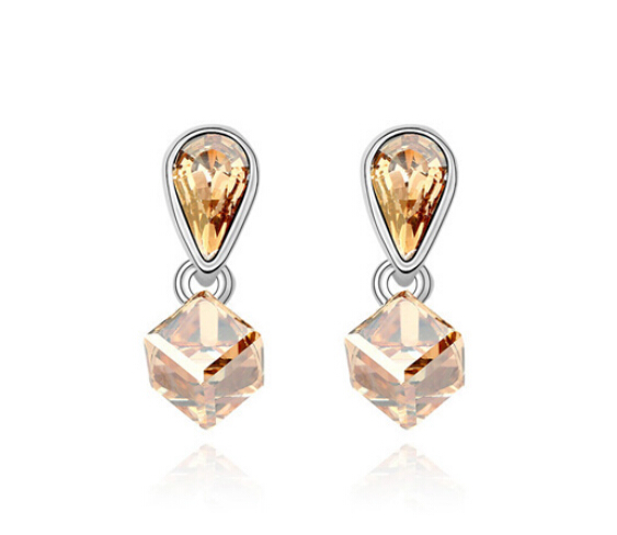 Preciosos Aretes, en baño de oro blanco de 18 quilates, con diseño de gota, cubo de cristal ámbar y cristal corte pera color ámbar.