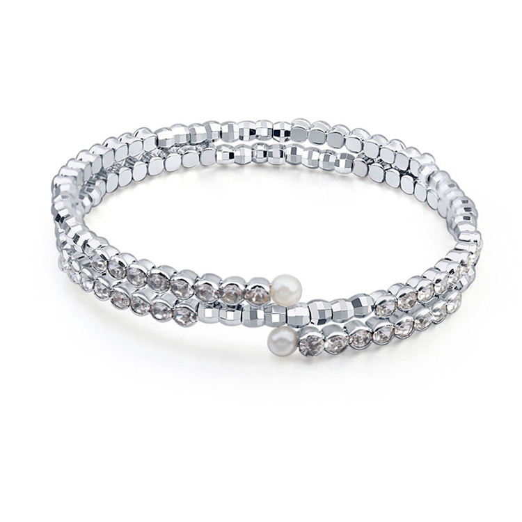 Elegante pulsera, en baño de oro blanco de 18 quilates, lindo diseño, estilo doble aro, con incrustaciones de cristales en color blanco.