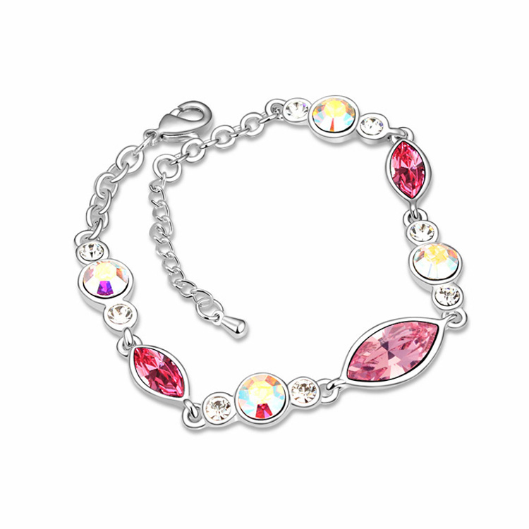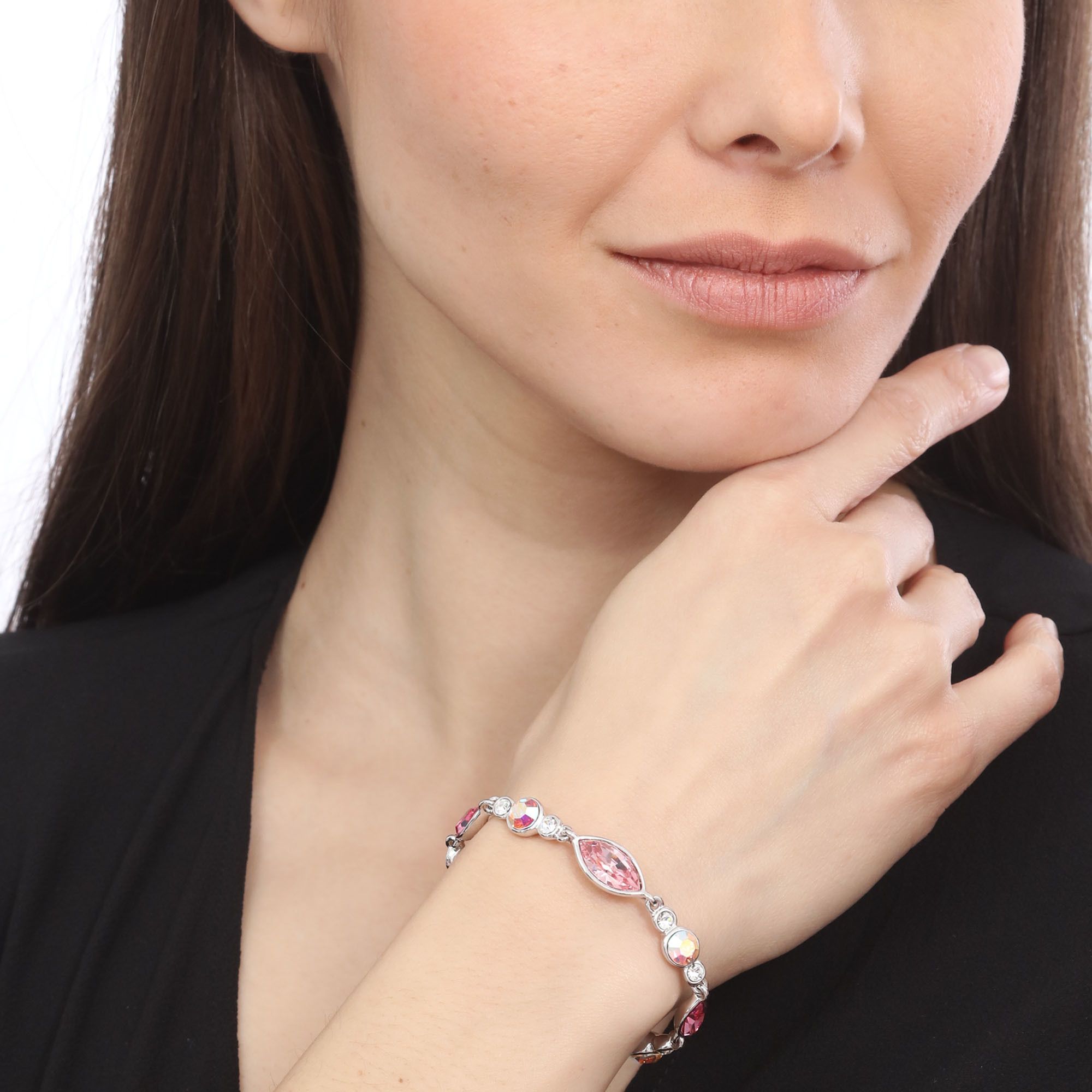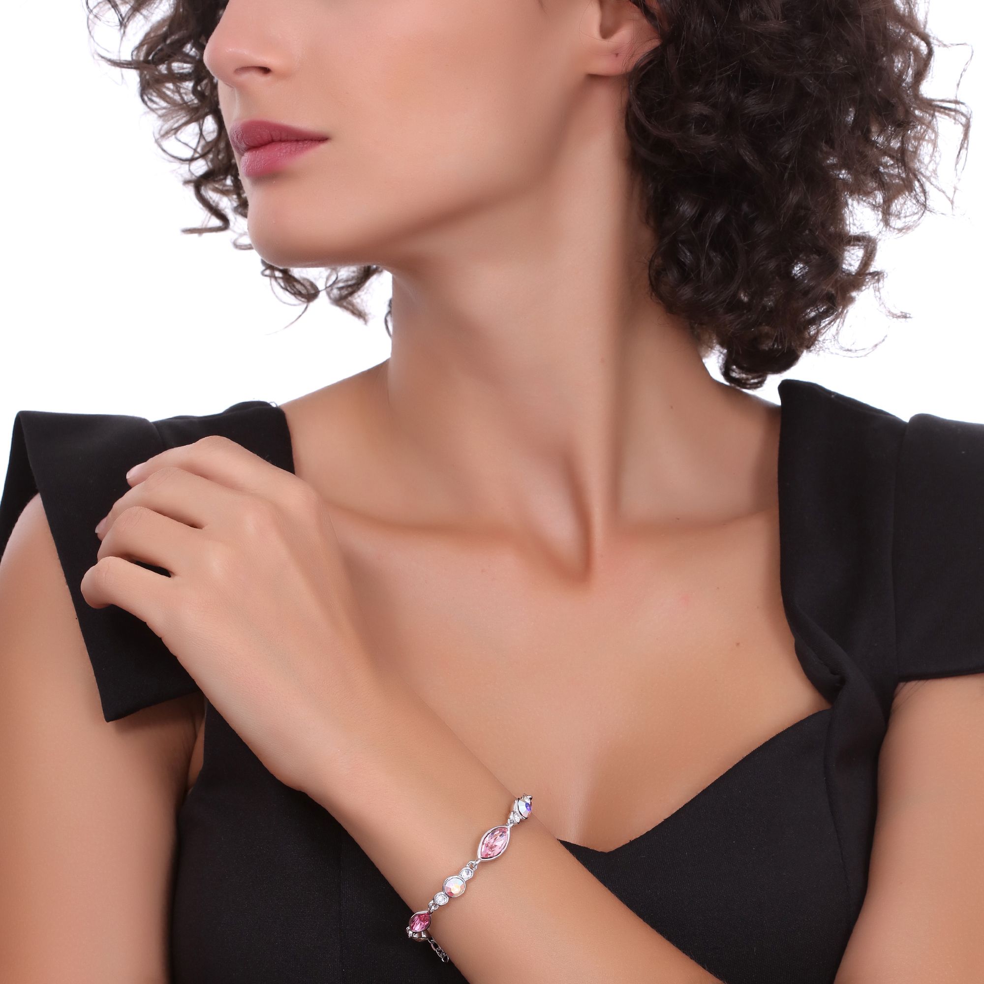 Pulsera en baño de oro blanco de 18 quilates, lindo diseño,con cristales en tonos rosa corte marquesa y cristales tornasol corte brillante e incrustaciones de cristales blancos.
