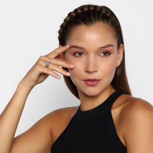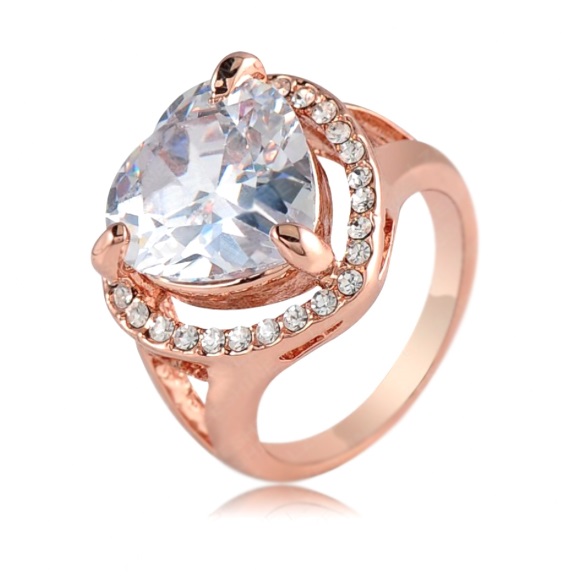 Anillo en baño de oro rosa de 18 quilates, diseño de corazón, con cristal blanco corte corazón e incrustación de cristales en color blanco.