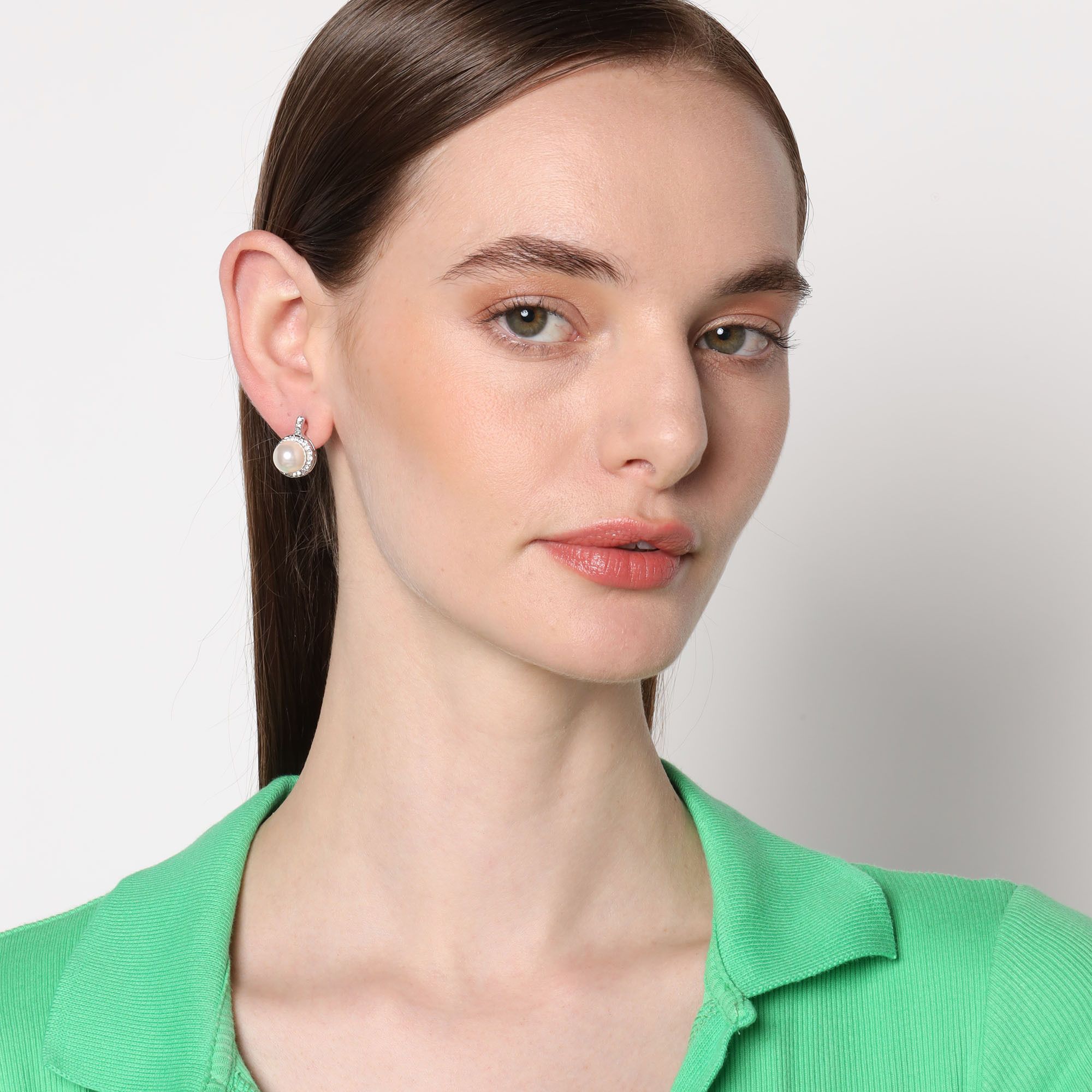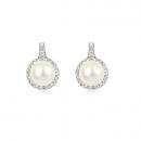 Aretes en baño de oro blanco de 18 quilates, bello diseño, con perla blanca e incrustaciones de cristales blancos.