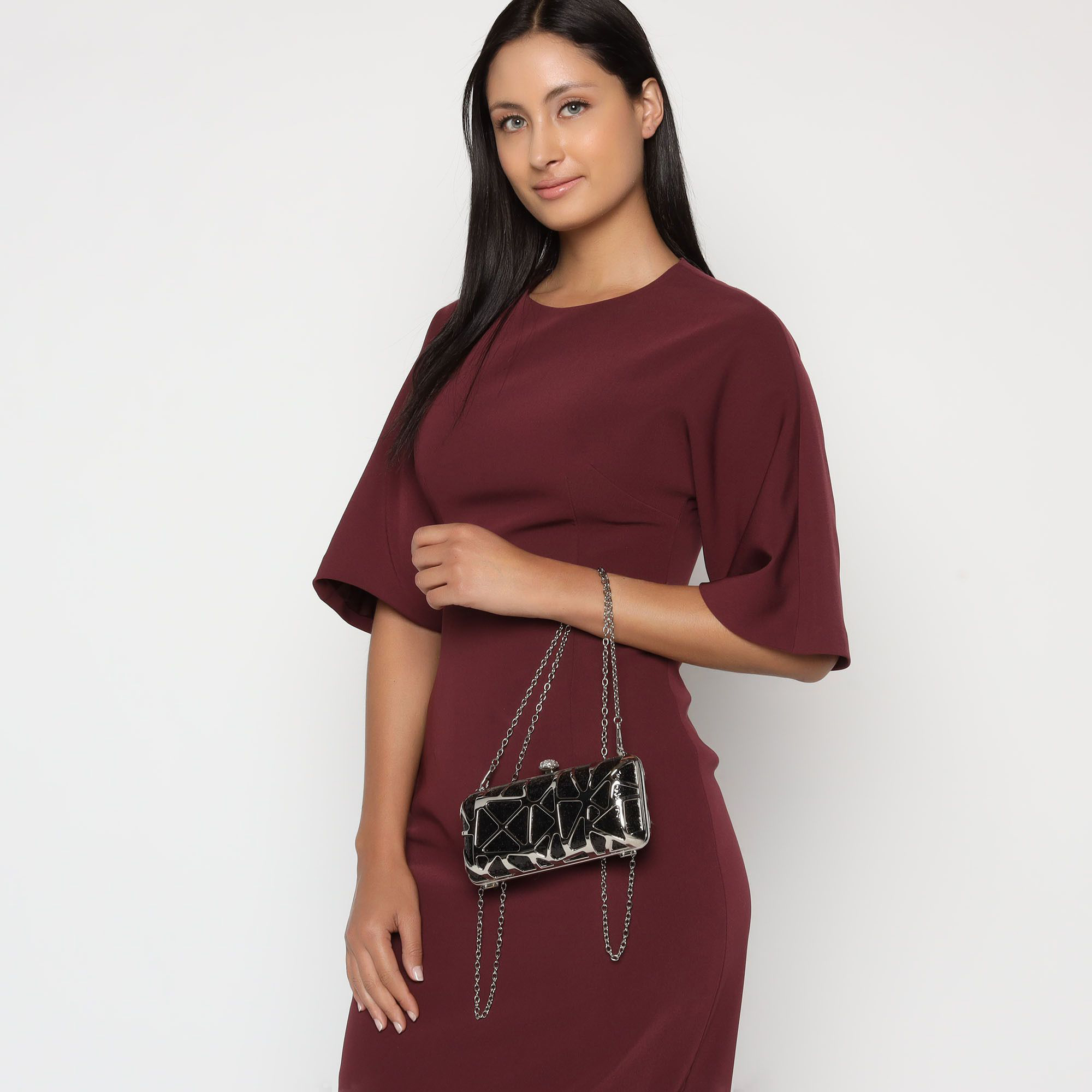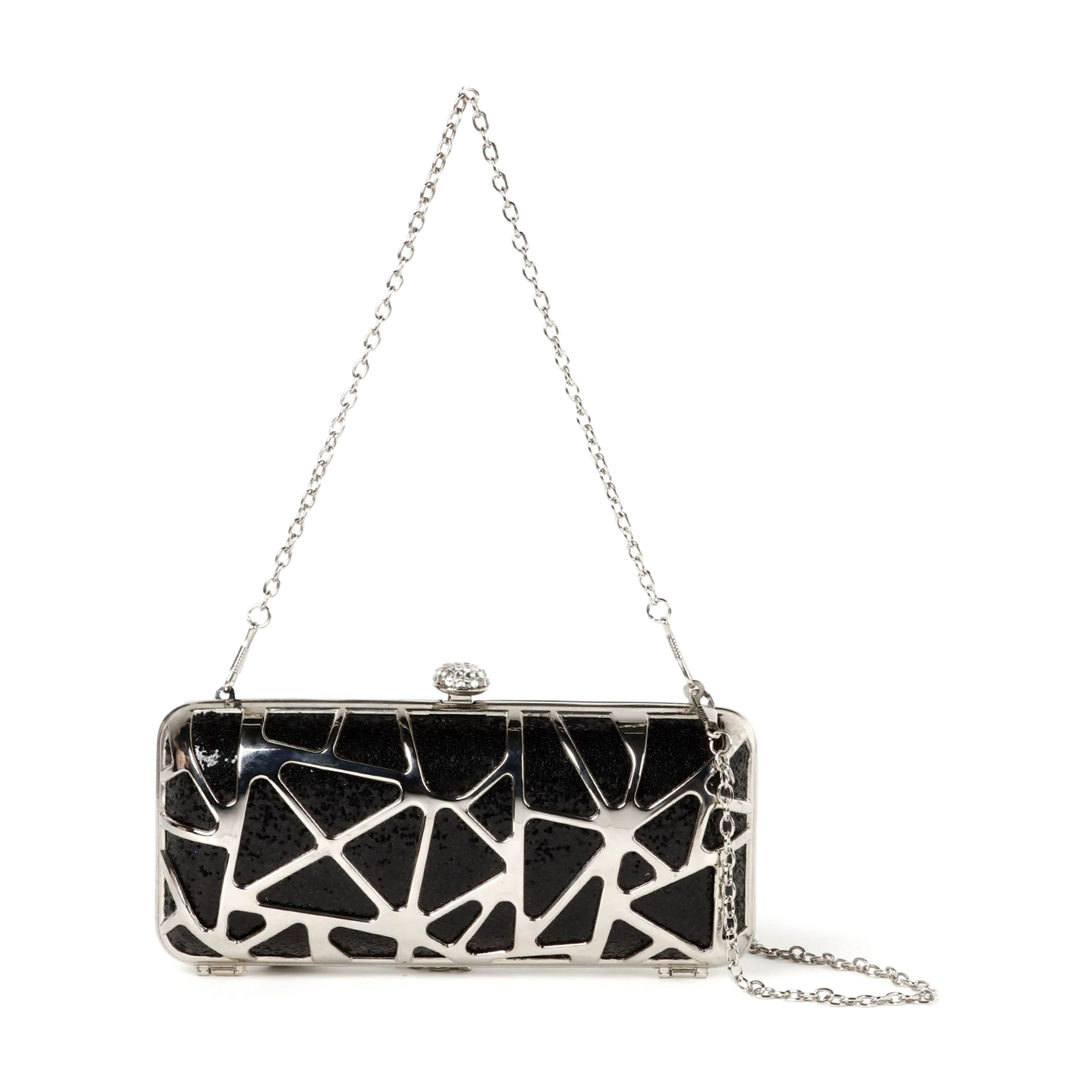 Bolso de noche en baño de oro blanco de 18 quilates, original diseño de triángulos, en color negro e incrustación de cristales blancos. Fabricado en una estructura de aleación de platino con rodio sin níquel.