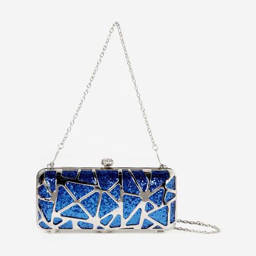 Bolso de noche en baño de oro blanco de 18 quilates, original diseño de triángulos, en color azul e incrustación de cristales blancos. Fabricado en una estructura de aleación de platino con rodio sin níquel