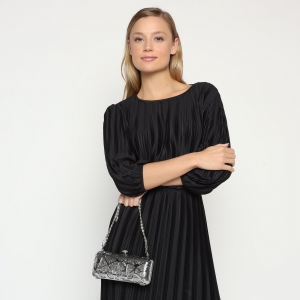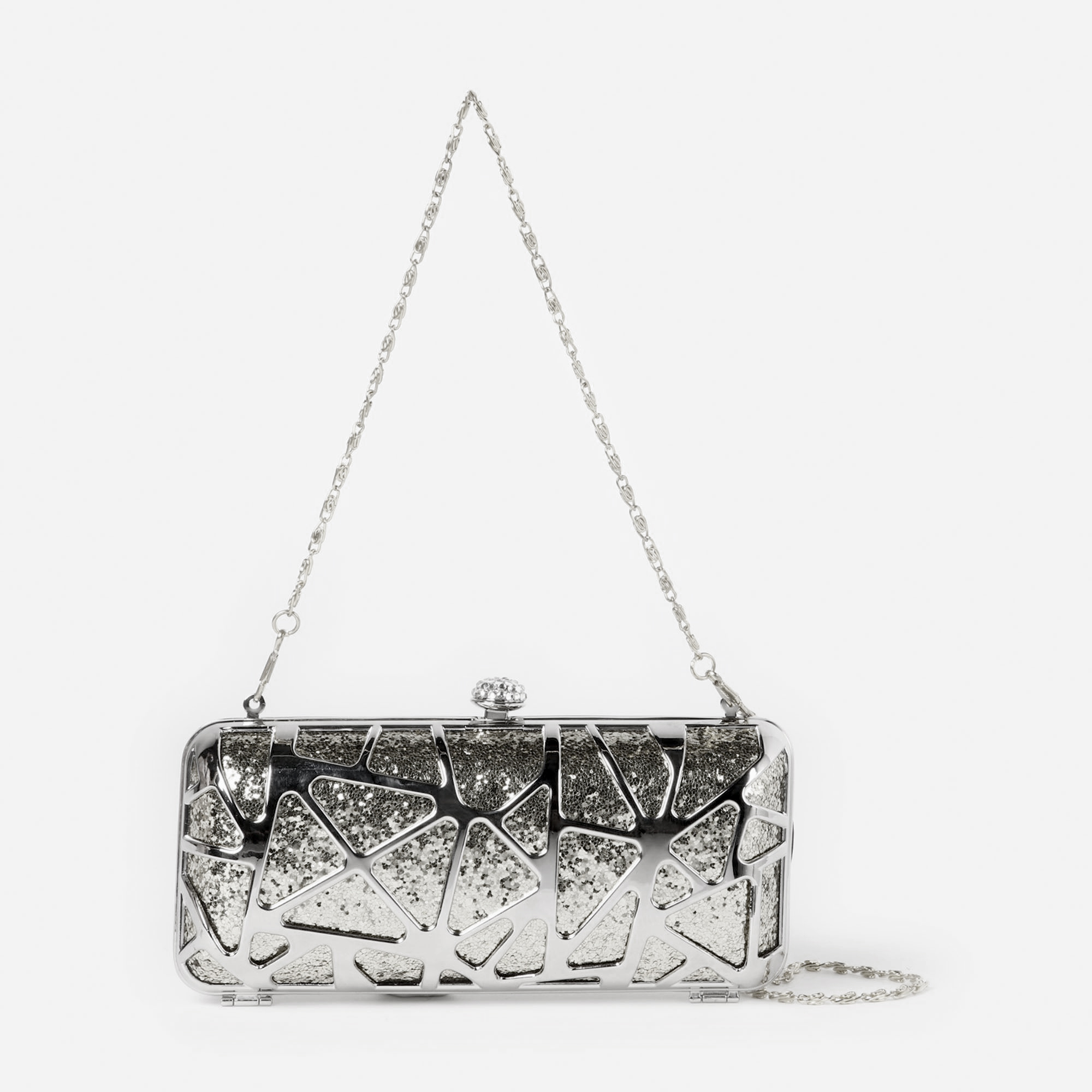 Bolso de noche, en baño de oro blanco de 18 quilates, original diseño de triángulos, en color plata e incrustación de cristales blancos. Fabricado en una estructura de aleación de platino con rodio sin níquel.